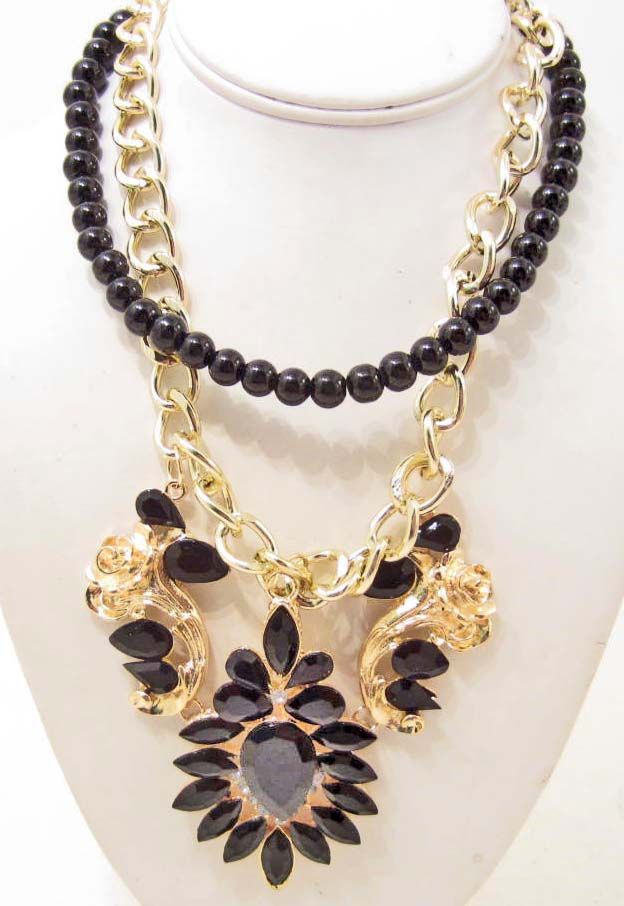 BLACK RHINESTONE FLORAL ESTATE JEWELRY NECKLACE