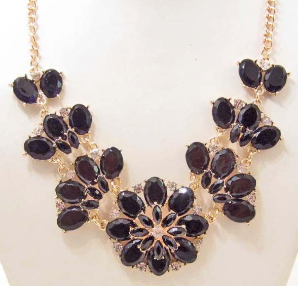 BLACK RHINESTONE FLOWERS ESTATE JEWELRY NECKLACE