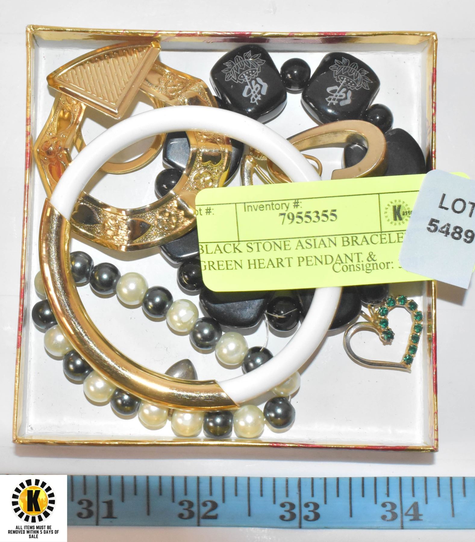 BLACK STONE ASIAN BRACELET, GREEN HEART PENDANT &