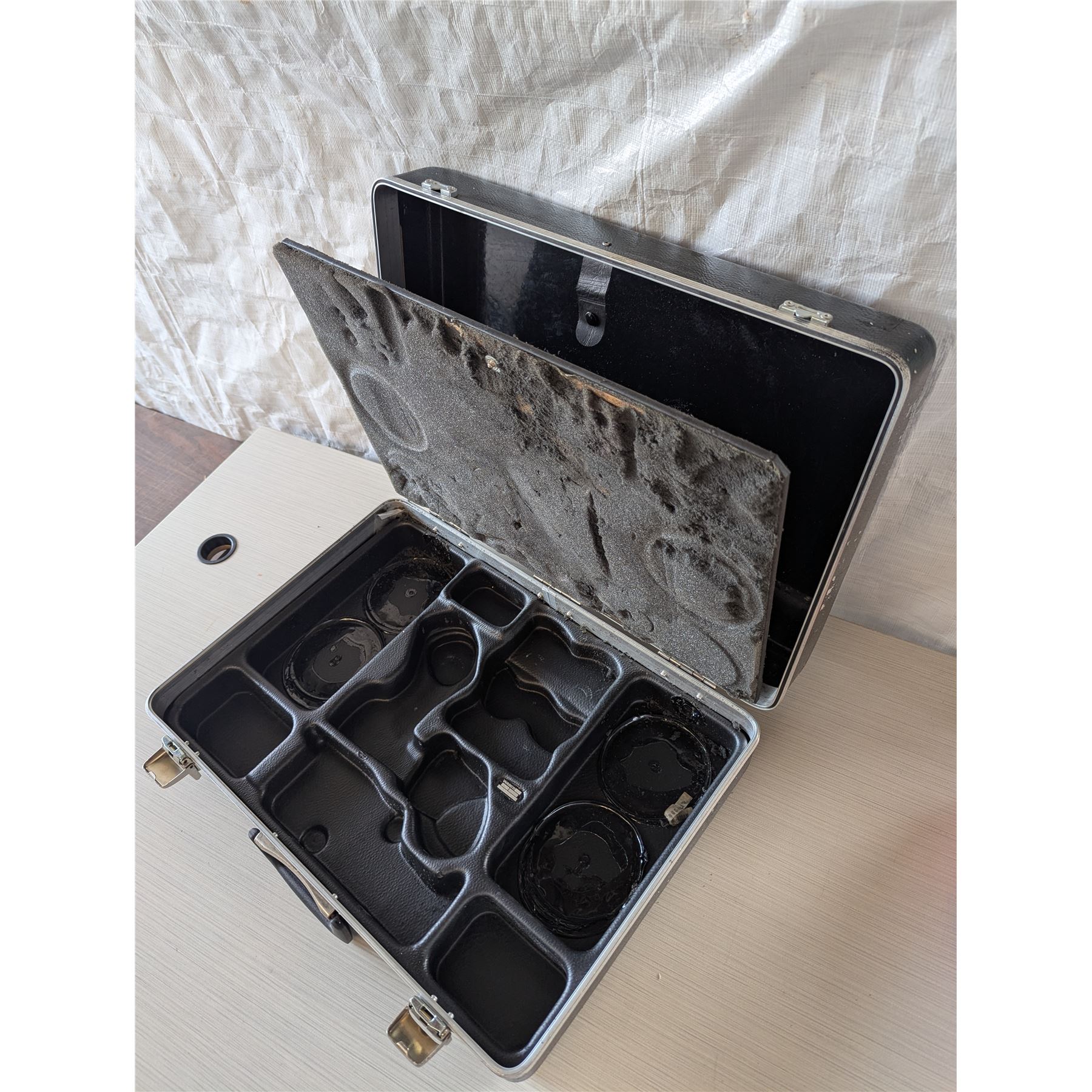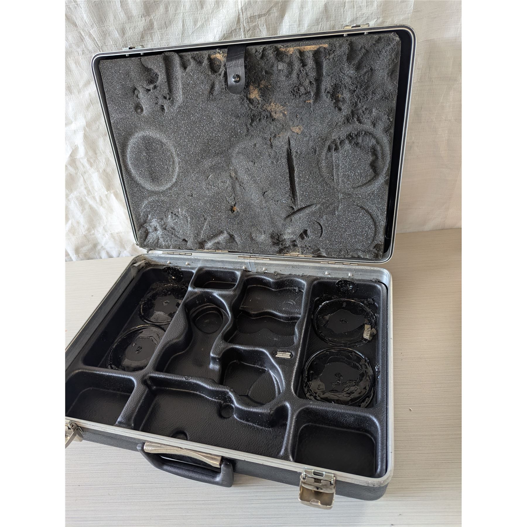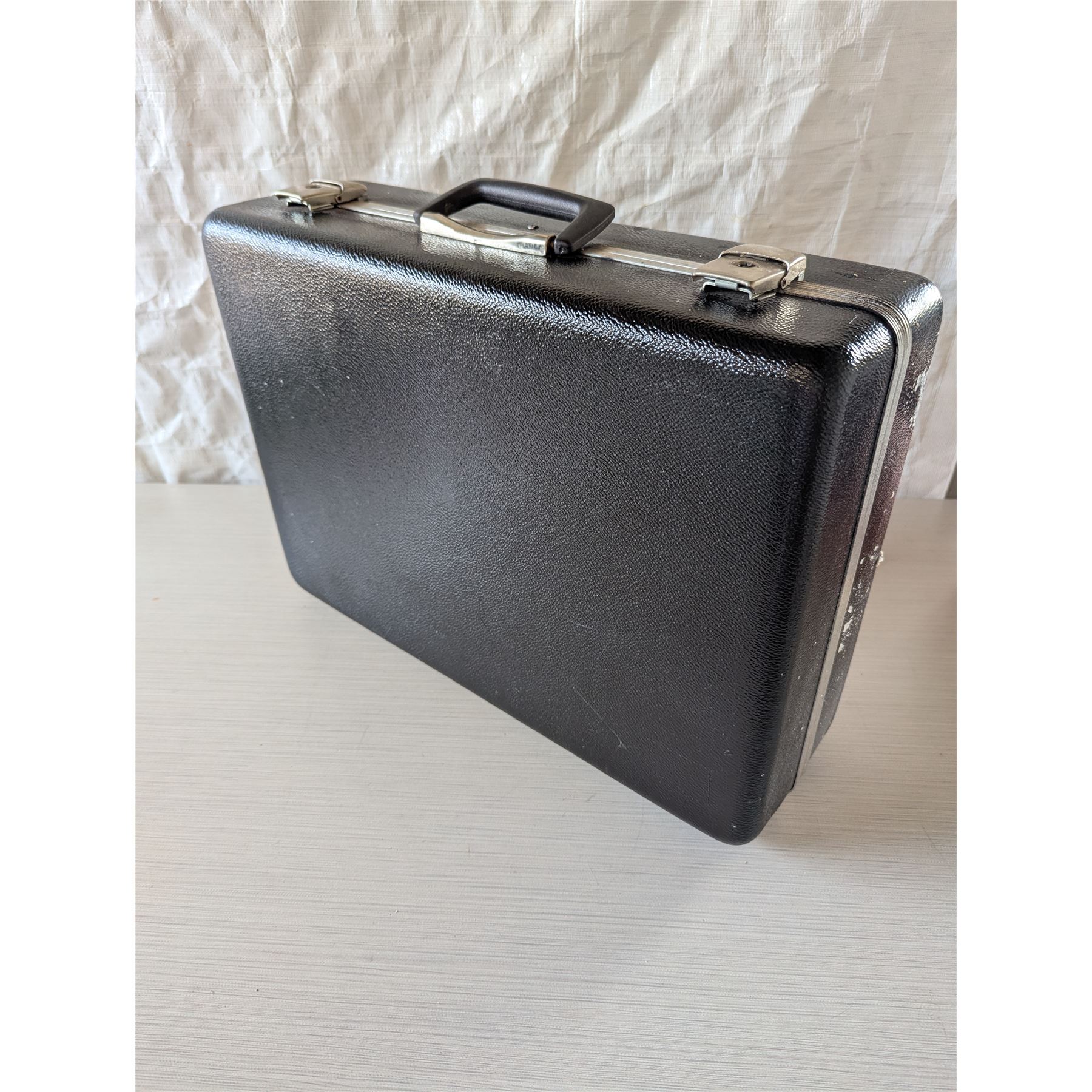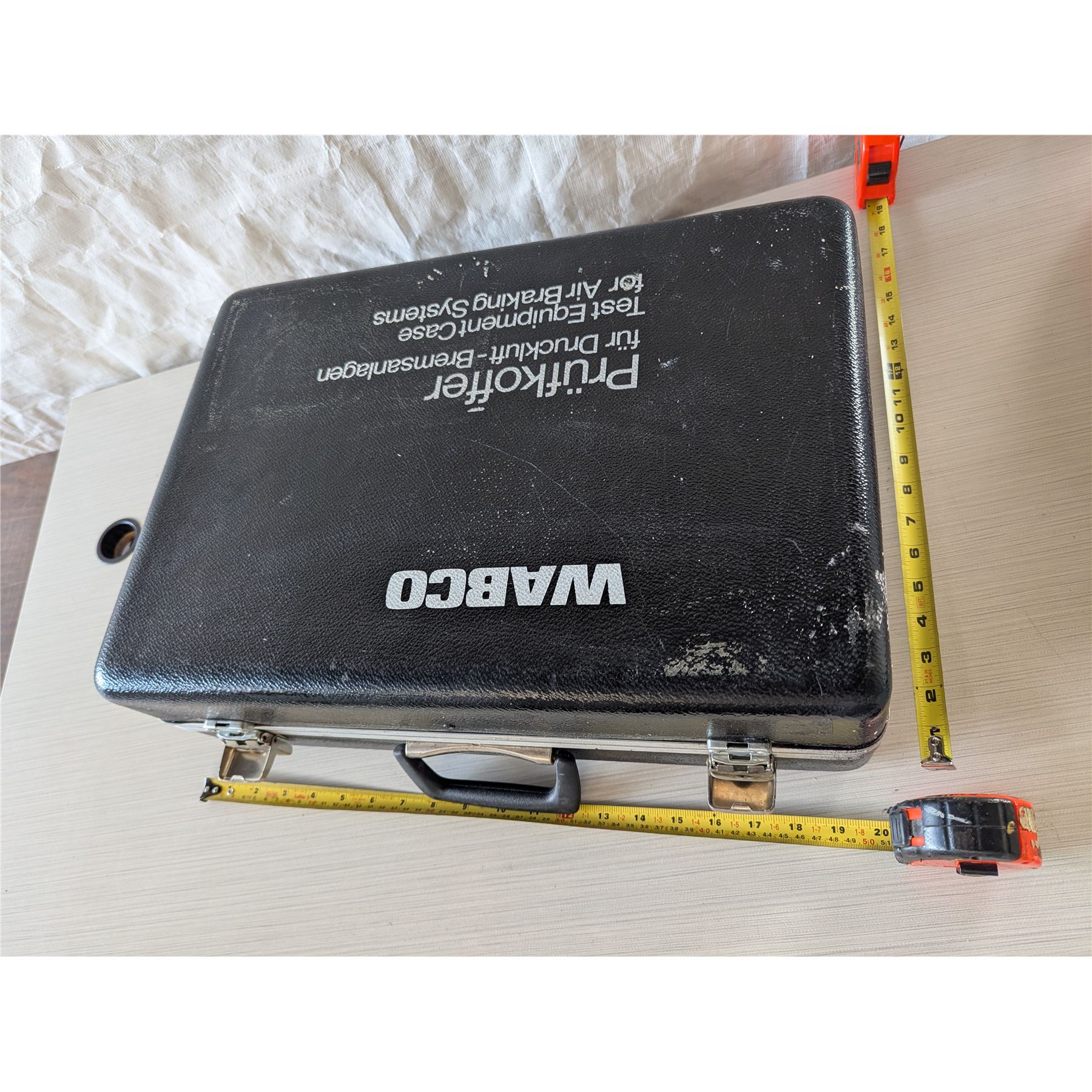 BLACK WABCO Hard shell case. A former test equipment for air brake systems case. Measures 29"x13"x 6.5". Split interior with hard black plastic component compartments. Black handles and both front clasps are operational.
