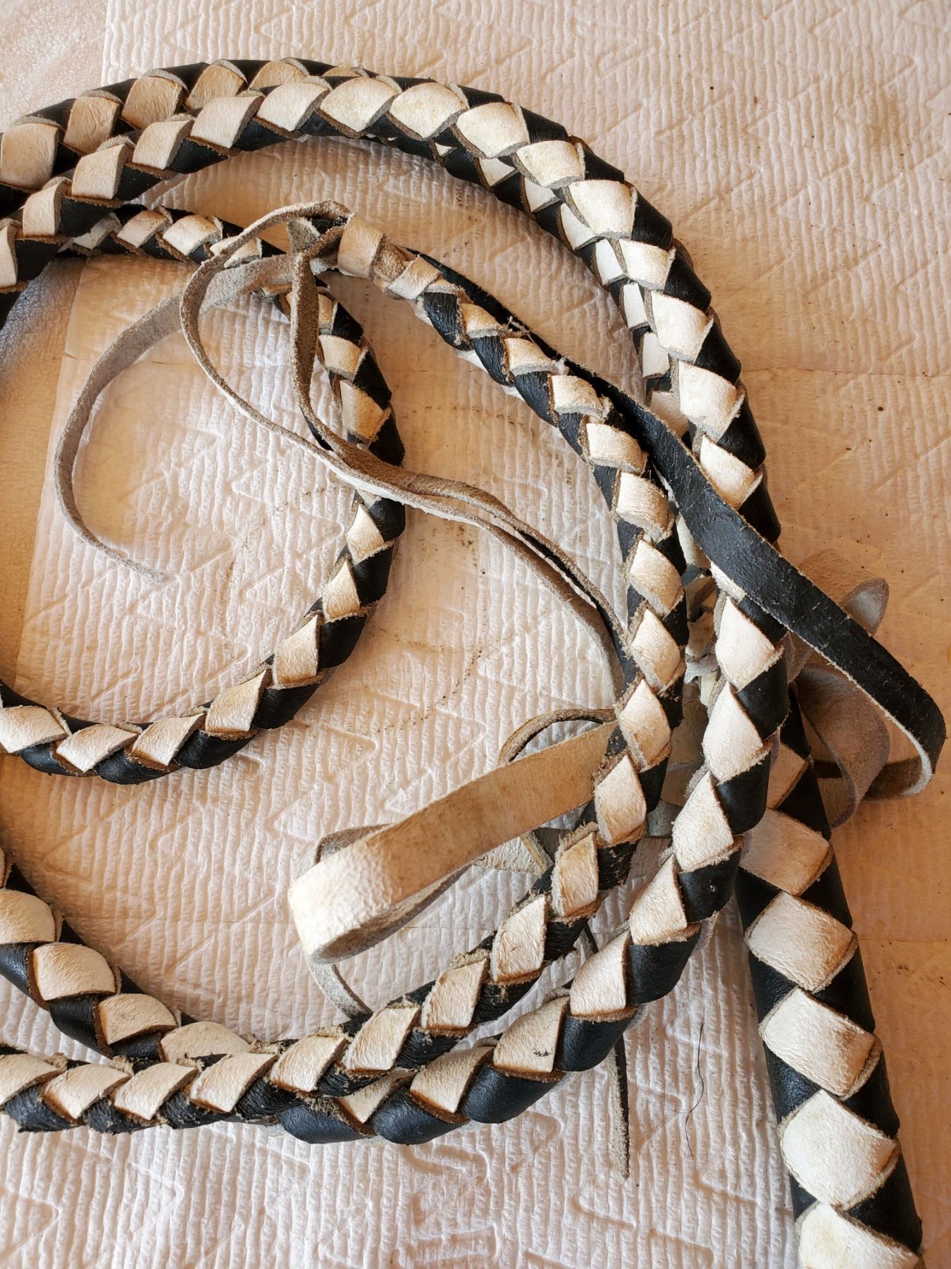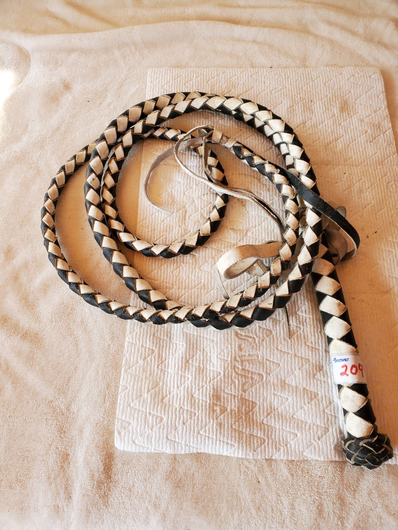BLACK & WHITE LEATHER BULL WHIP, ALMOST 8' LONG (NOT OLD) GREAT WESTERN DISPLAY PIECE