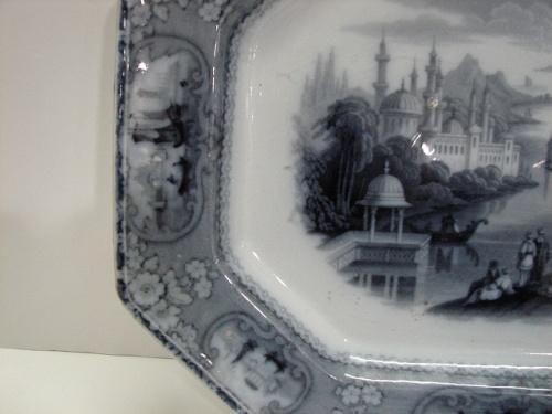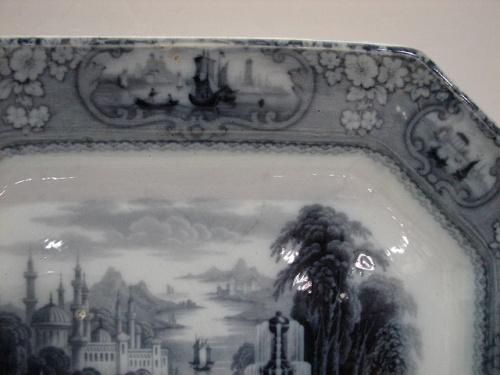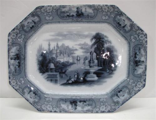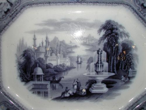 J. FURNIVAL & CO., ENGLAND BLACK & WHITE TRANSFERWARE PLATTER. Depicts a river scene with boats and garden. Marked on reverse “Medina/J.F. & Co.” 17” L