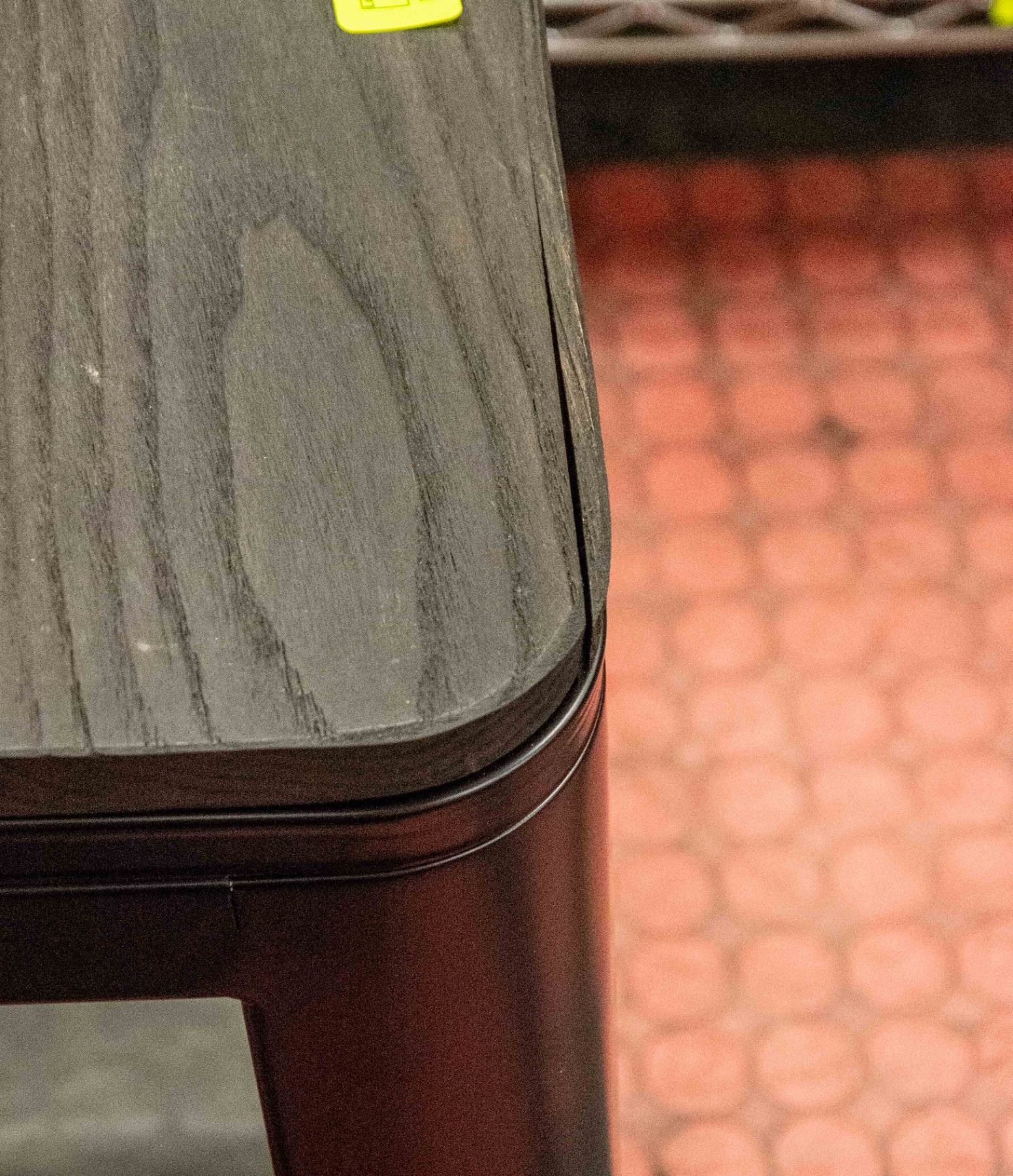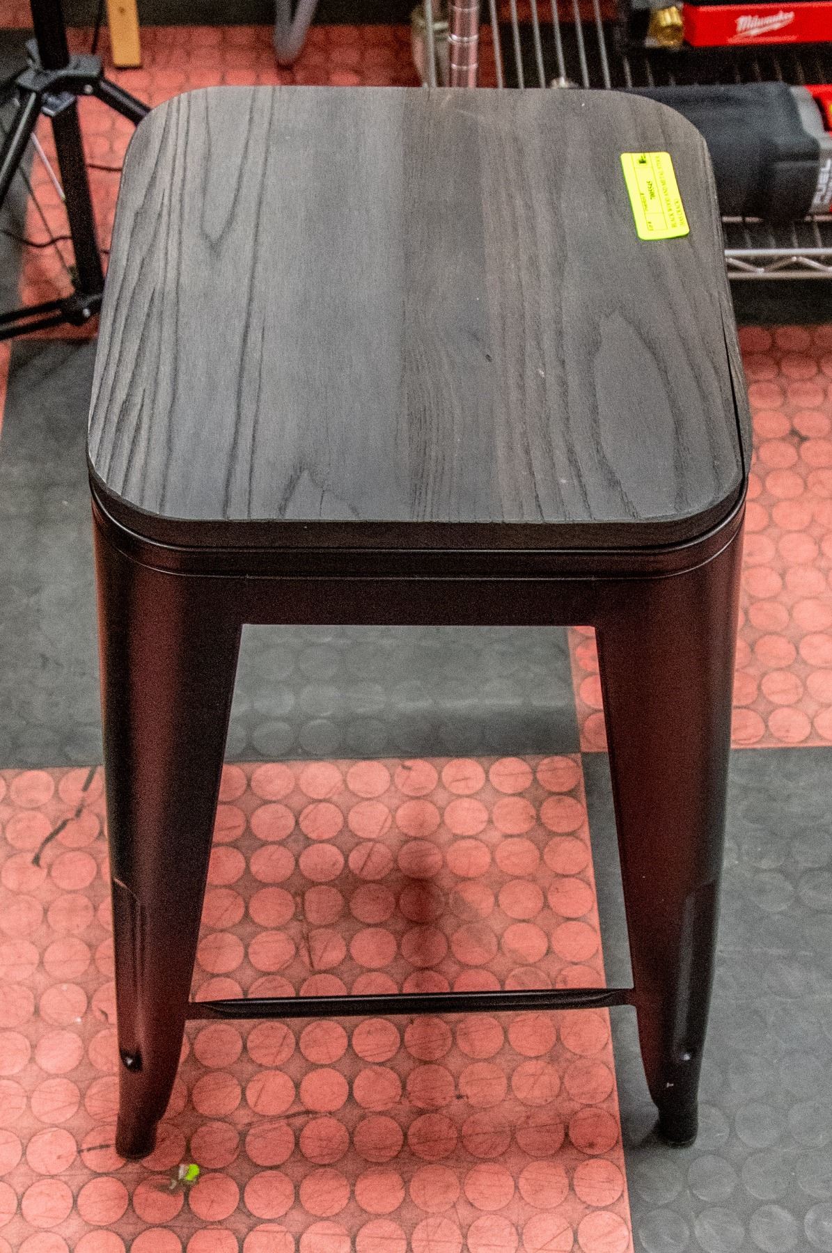BLACK WOOD AND METAL STOOL (HAS A CRACK)
