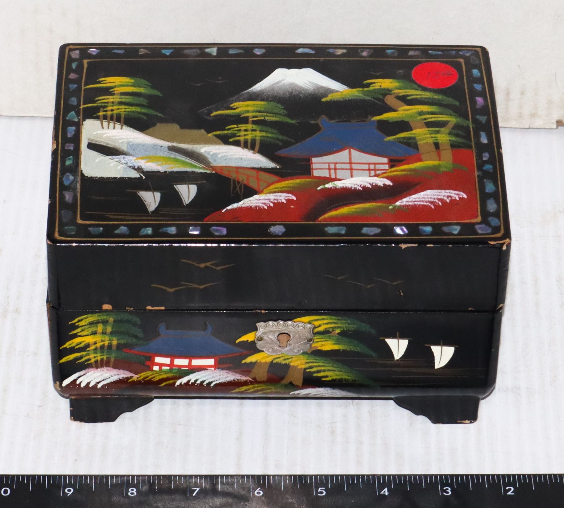 ASSORTED FASHION JEWELRY INSIDE. JAPANESE THEMED MUSIC BOX