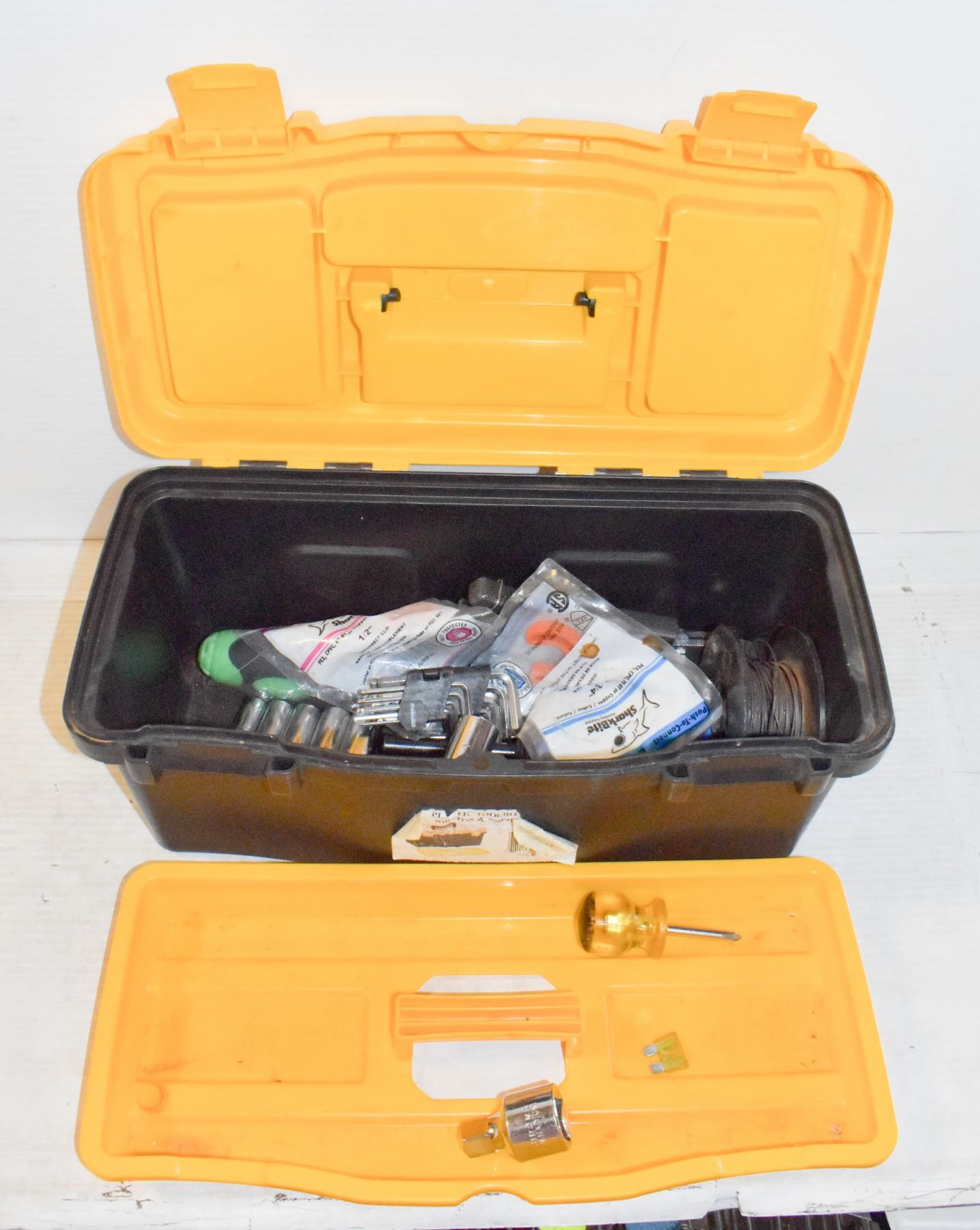 BLACK/YELLOW TOOL BOX WITH VARIOUS CONTENTS