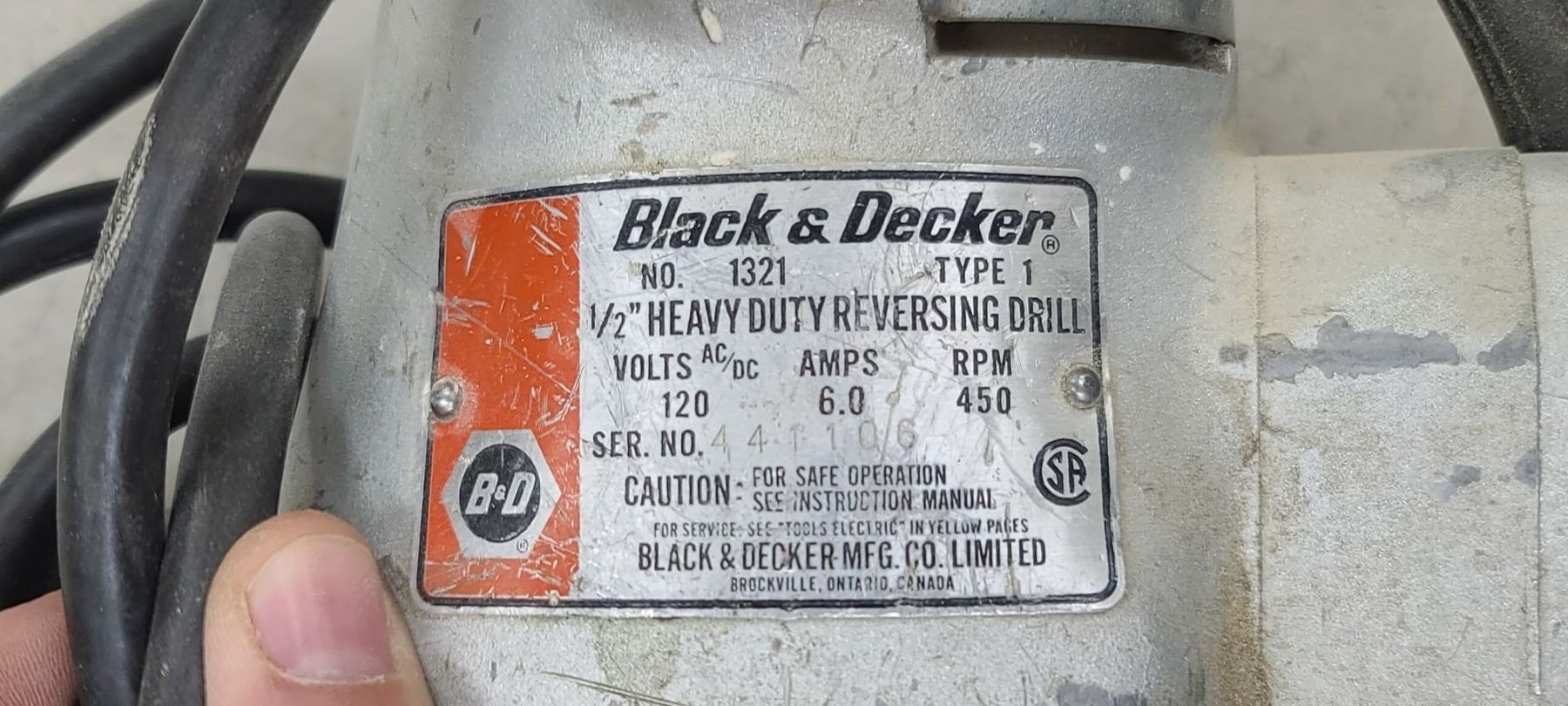 BLACKM AND DECKER 1/2" HEAVY DUTY REVERSING DRILL TYPE 1 MODEL NUMBER 1321