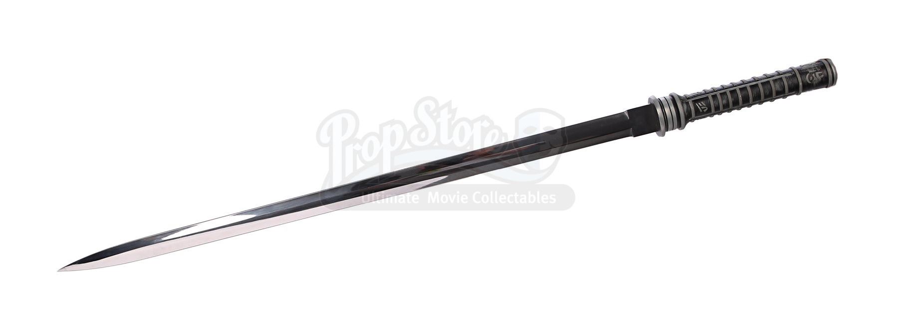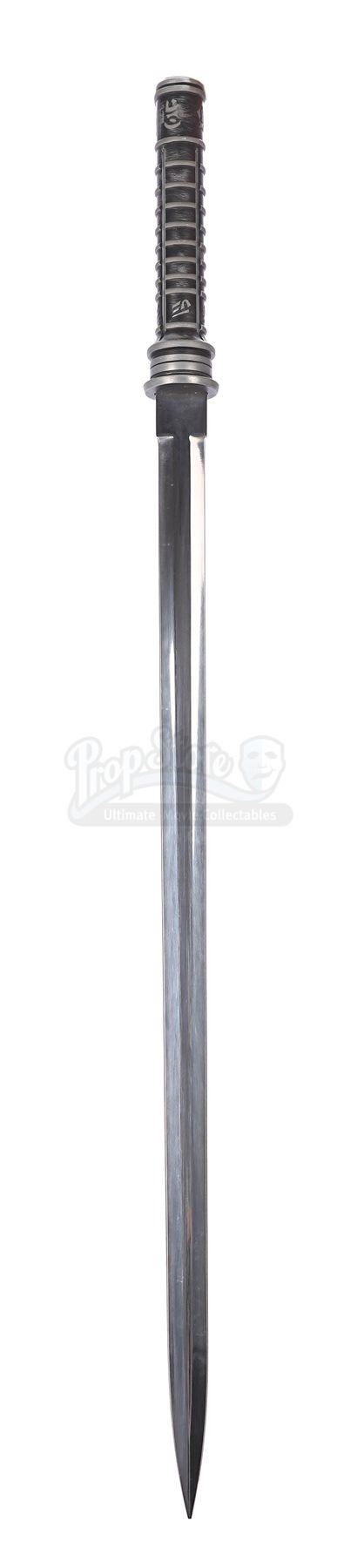 The weapon was created by sword maker Tony Swatton and displays a thin, polished aluminium blade with fuller detailing running down its length. Finished in black and faux-silver paint, the round grip is flat on one side and is decorated with ornate vampiric glyphs and ribbed detailing. Signs of wear from production use are present on the weapon, including paint wear on the handle, minor scratches and marks on the blade. Dimensions: 89 cm x 5 cm x 4.5 cm (35” x 2” x 1 ¾”)