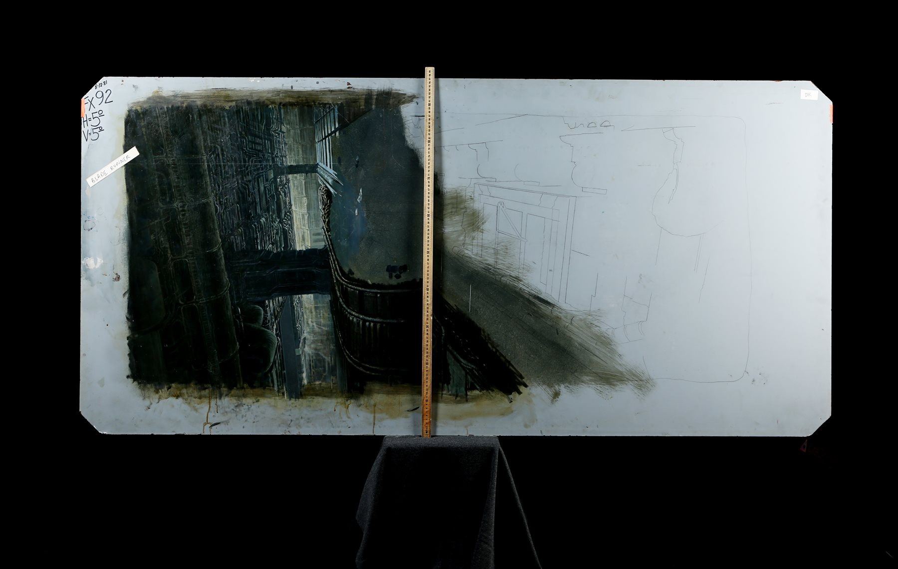 Written at the top left corner of the board is the date “8-12-81”, along with “FX 92”, “H=5o”, and “V=5o”. The artwork shows wear to the masonite due to production use and age, with small areas of the paint sympathetically restored by uncredited Blade Runner matte artist Rocco Gioffre. The piece remains in fine condition. Dimensions: 203 cm x 96.5 cm x 0.5 cm (80” x 38” x ¼”)