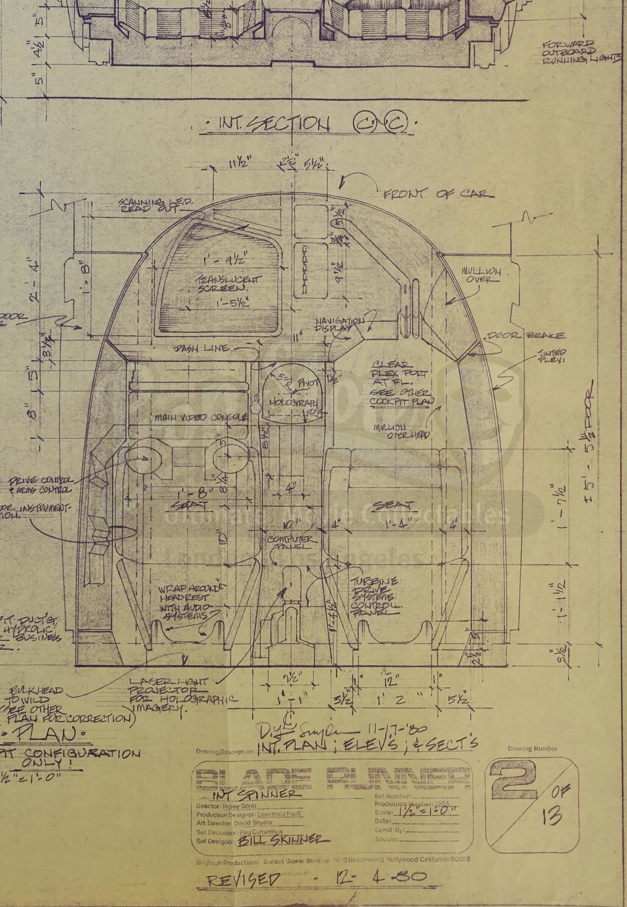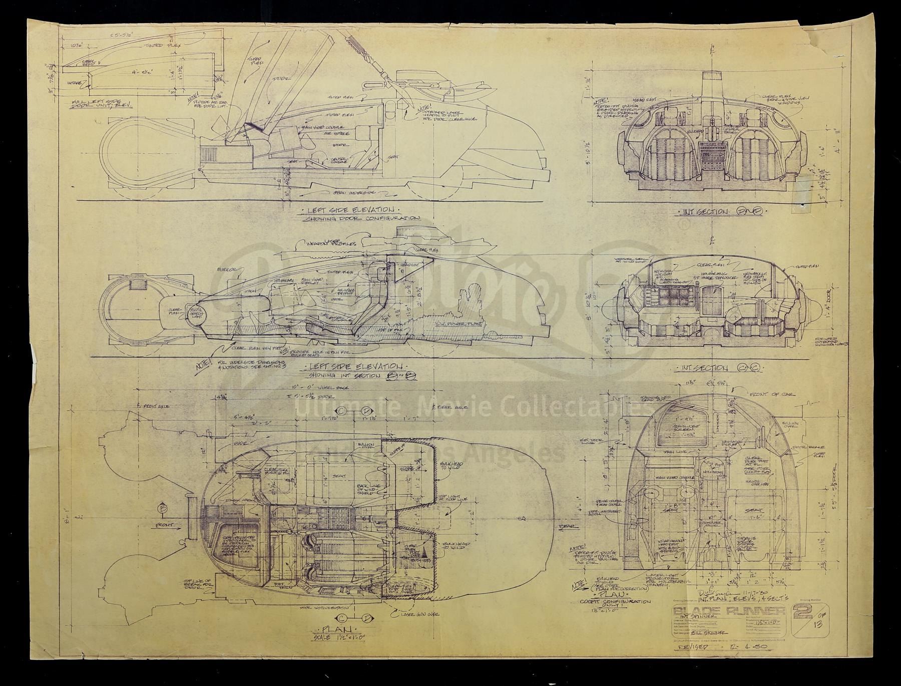 This blueprint is based on the designs of Syd Mead, the film's visual futurist, and was originally drawn by set designer William Ladd Skinner. It features side, back, and bird's eye views of the spinner's interior, and is dated "12-4-80". The blueprint exhibits small tears along the edges, visible yellowing to the paper from age, and other signs of use, including tape on the back. Dimensions: 92.75 cm x 110.5 cm (36 1/2" x 43 1/2")