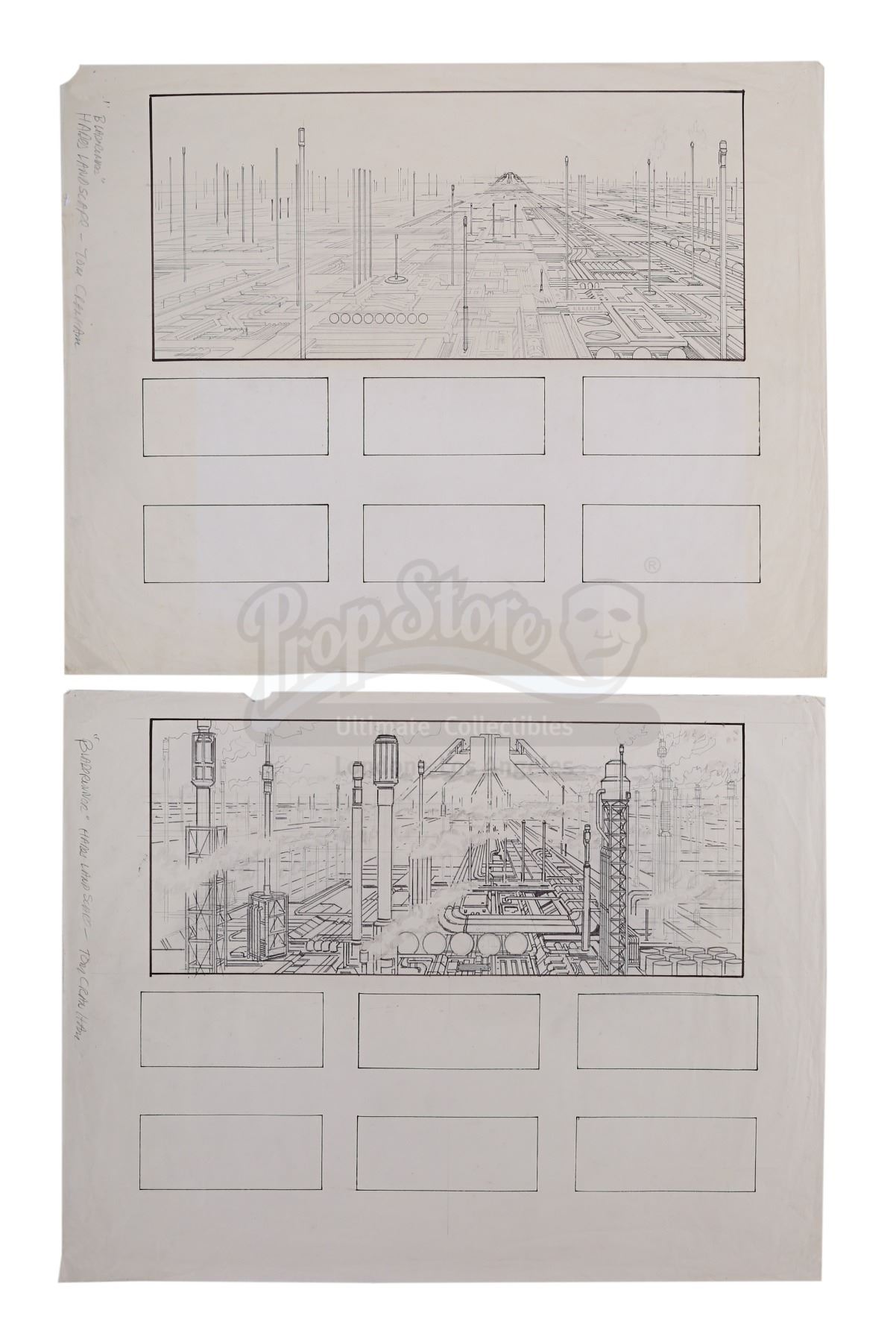 Two hand-drawn sketches from the production of Ridley Scott's sci-fi thriller Blade Runner. Created by effects illustrator Tom Cranham, the artwork depicts the highly detailed industrial 'Hades Landscape' seen during the film's opening sequence. Rendered in pencil on tracing paper, both sketches show front views of the distinctive structures which formed the future-LA skyline, with added smoke clouds filling parts of the sky. Six smaller empty boxes are situated below the artwork on both pages, and each sheet is labelled "Blade Runner, Hades Landscape - Tom Cranham" on the left edge. The sketches display signs of production use, including minor crease lines, pin holes, slight discolouration and small tears around the edges. Dimensions (each sheet): 68.5 cm x 53 cm (27" x 21")