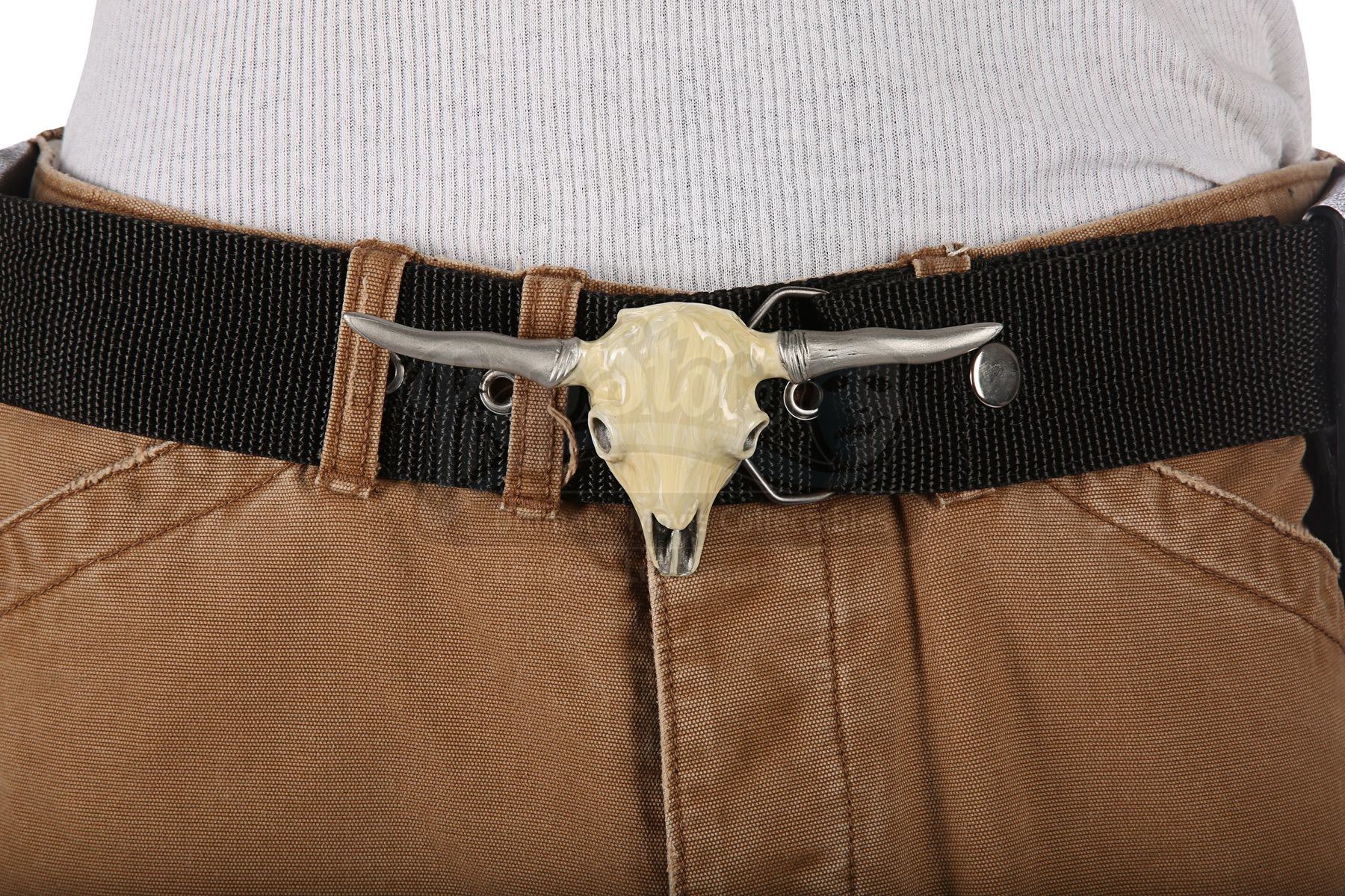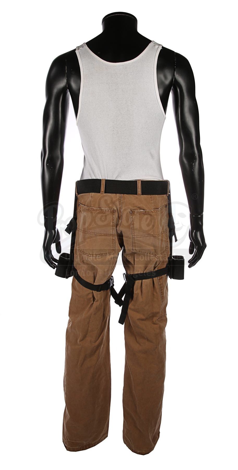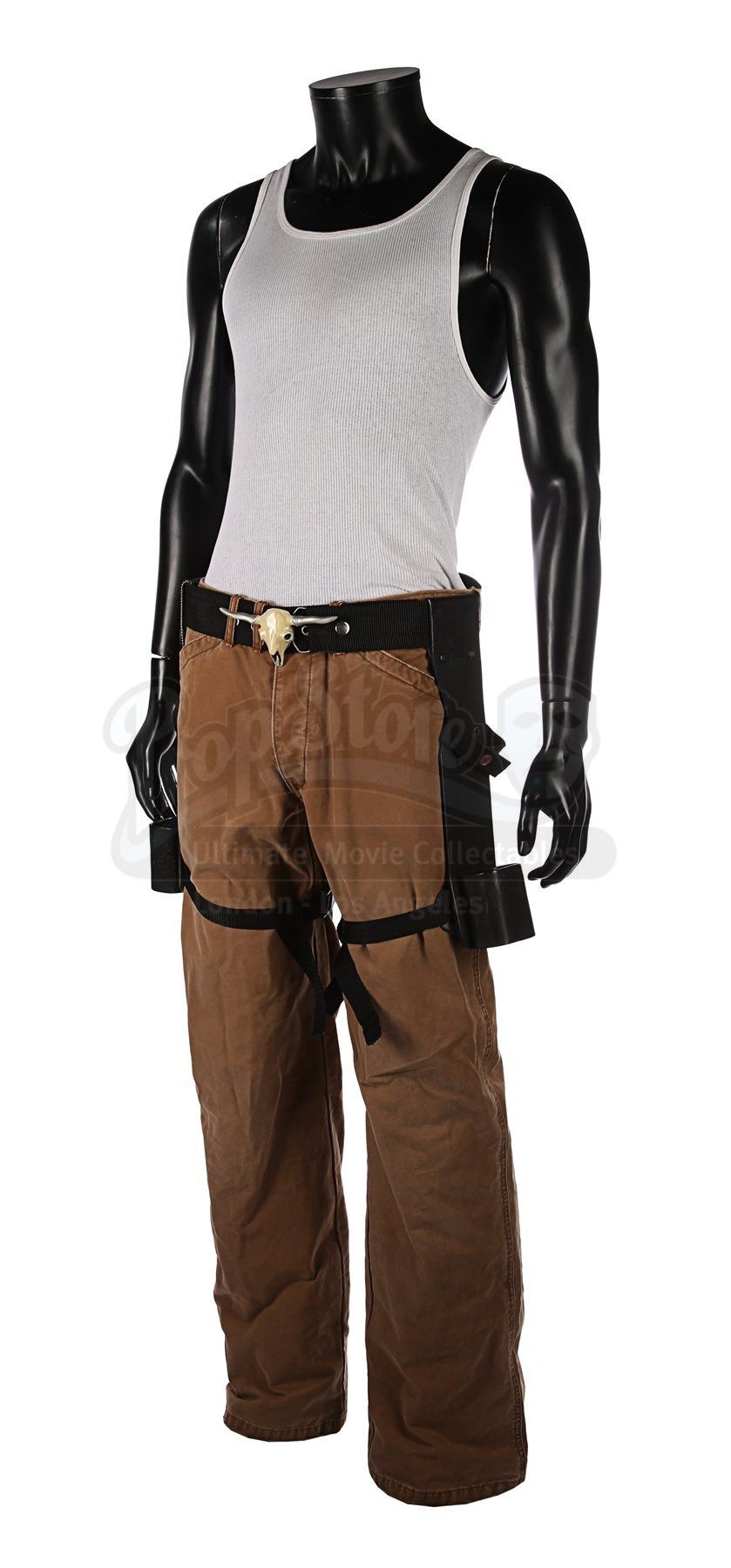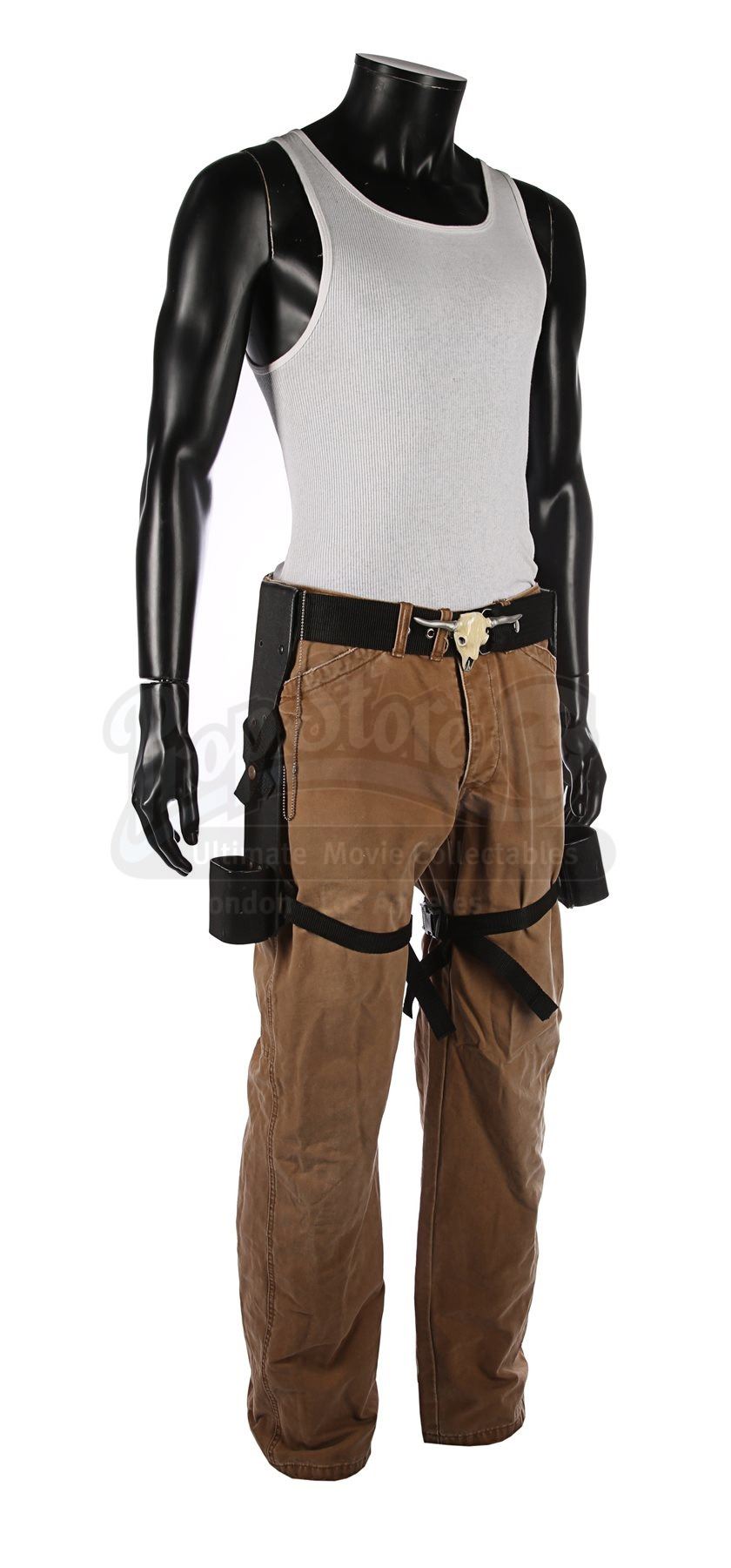 The costume consists of a white ribbed cotton vest, a pair of brown cargo trousers and a black nylon duty belt with two plastic holsters attached. A bull skull emblem finished in cream and faux silver adorns the front of the belt, and a ball chain with a metal Stanley Guess pendant is suspended from a front belt loop. Both holsters display minor wear from production use and the lot is accompanied by a New Line Cinema letter of authenticity.