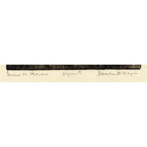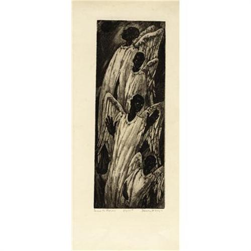 <B>BLANCHE MCVEIGH (1895-1970)</B></I><BR><I>Gwine to Heaven</B></I>, 1945<BR>Etching and aquatint on paper<BR>15 x 7 inches (38.1 x 17.8 cm)<BR>Signed lower right<BR>Titled lower left<BR><BR> Blanche McVeigh's most famous print is based on her impressions of a Negro spiritual. <I>Gwine to Heaven</B></I> was awarded the Lila May Chapman prize of the Southern States Art League and was included in the book, <I>American Prize Prints of the Twentieth Century</B></I>. It was invited the same year to a special print show at the Carnegie Institute. It was also selected as a purchase for inclusion in the Pennell Fund Exhibit at the Library of Congress. The print was exhibited at the Laguna Beach Art Association, Dallas Print Club, Society of American Etchers, Prairie Print Makers, and the California Print Club.<BR><BR>Exhibited:<BR>Southern States Art League (prize), Carnegie Institute, Library of Congress-Pennell Fund Purchase, Laguna Beach Art Association, Dallas Print Club, Society of American Etchers, Prairie Print Makers, California Print Club<B>Condition Report:</B> Excellent condition. Unframed.<BR><BR><b>Shipping:</b> Requires 3rd Party Shipping (<a target="_blank" href="http://www.heritageauctions.com/common/shipping.php">view shipping information</a>)