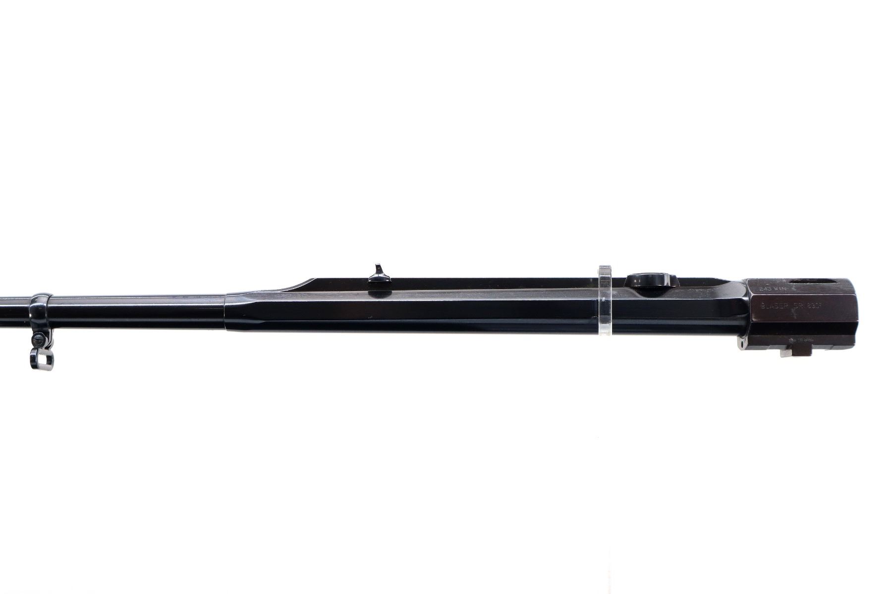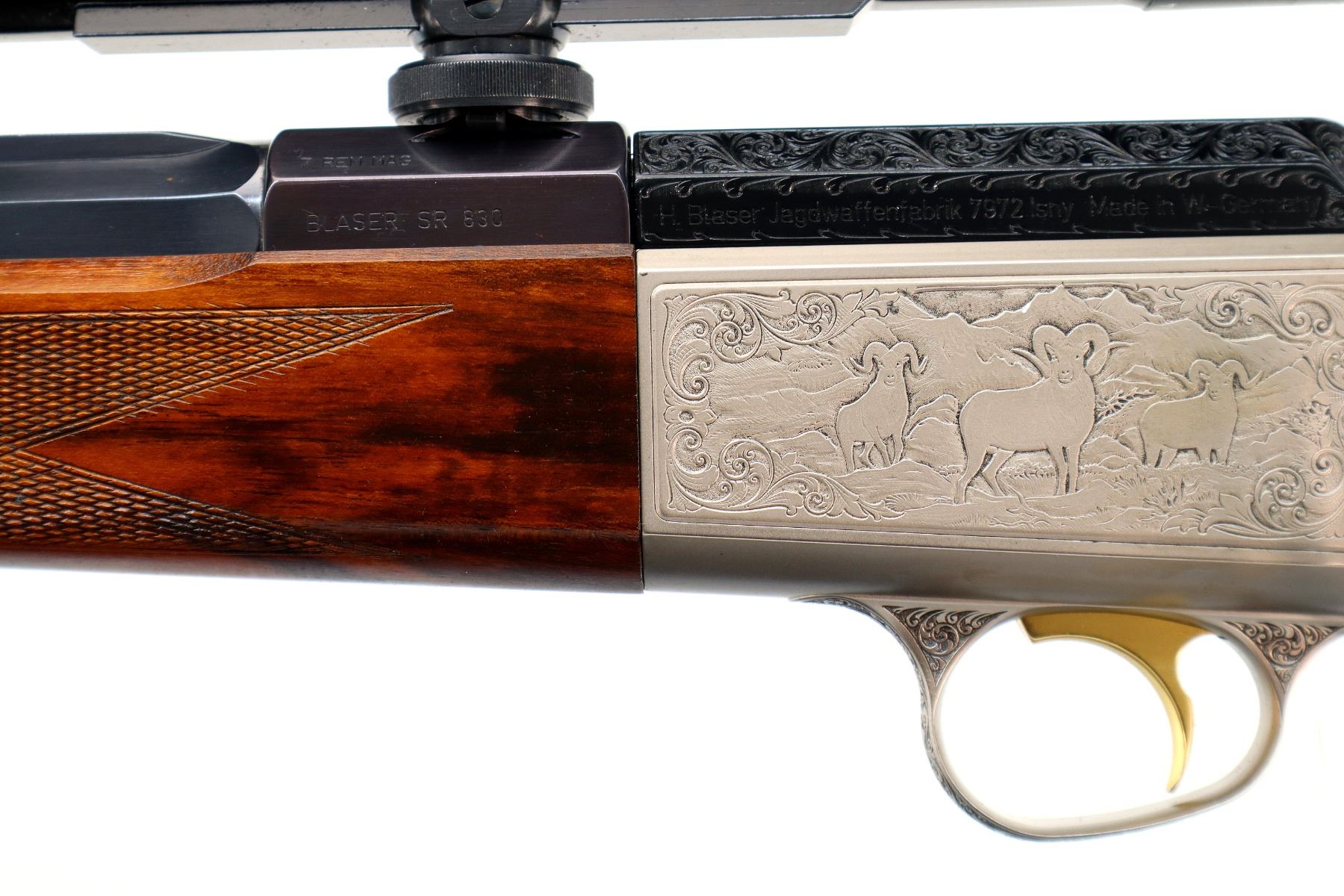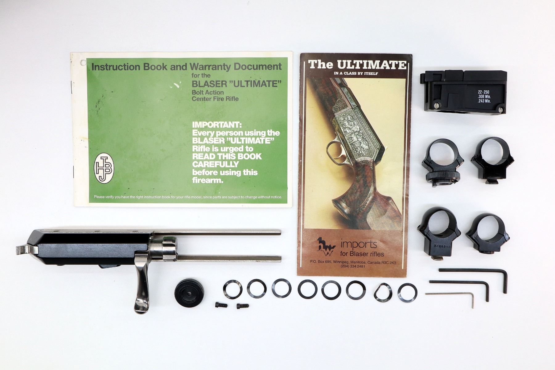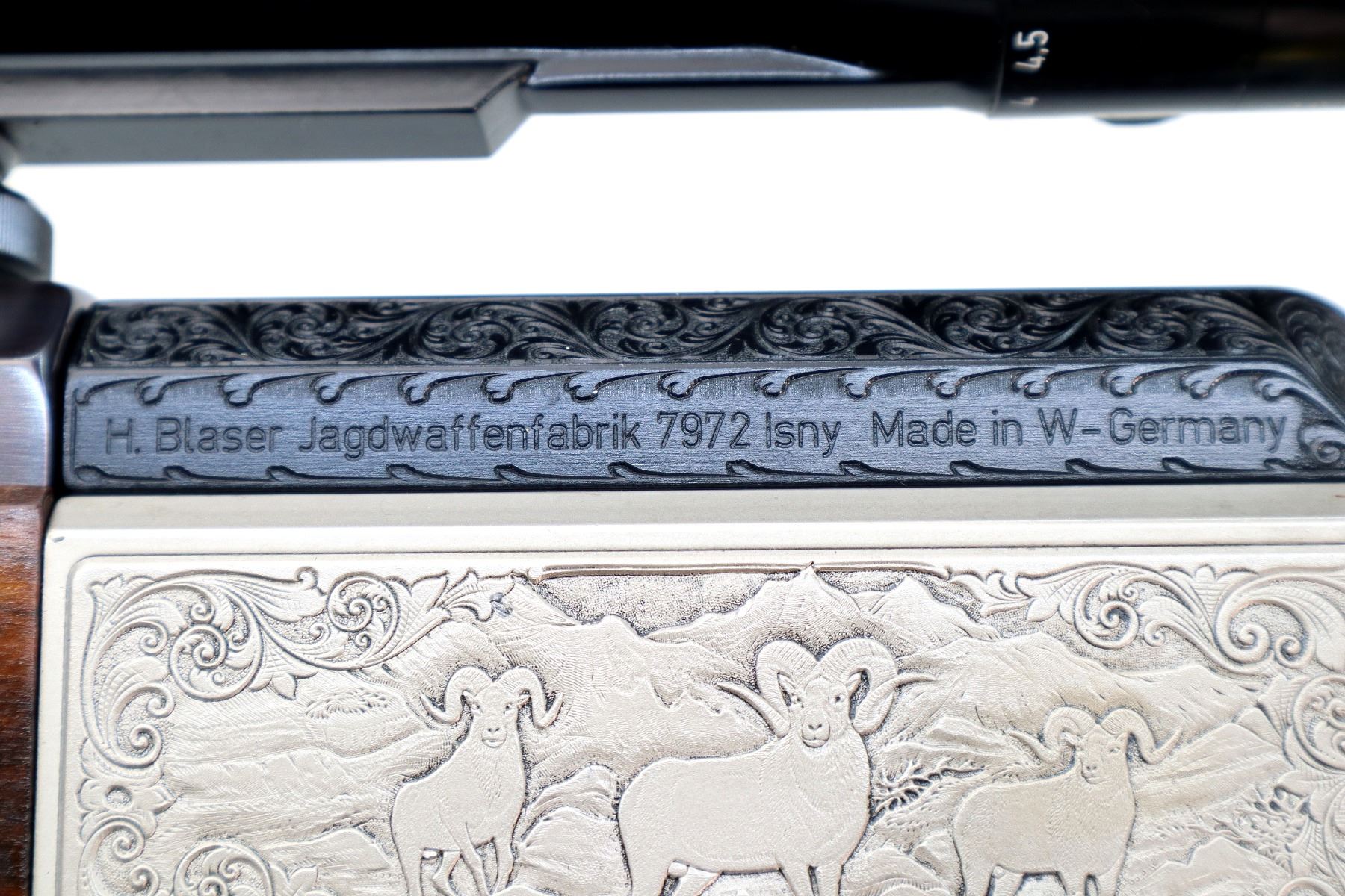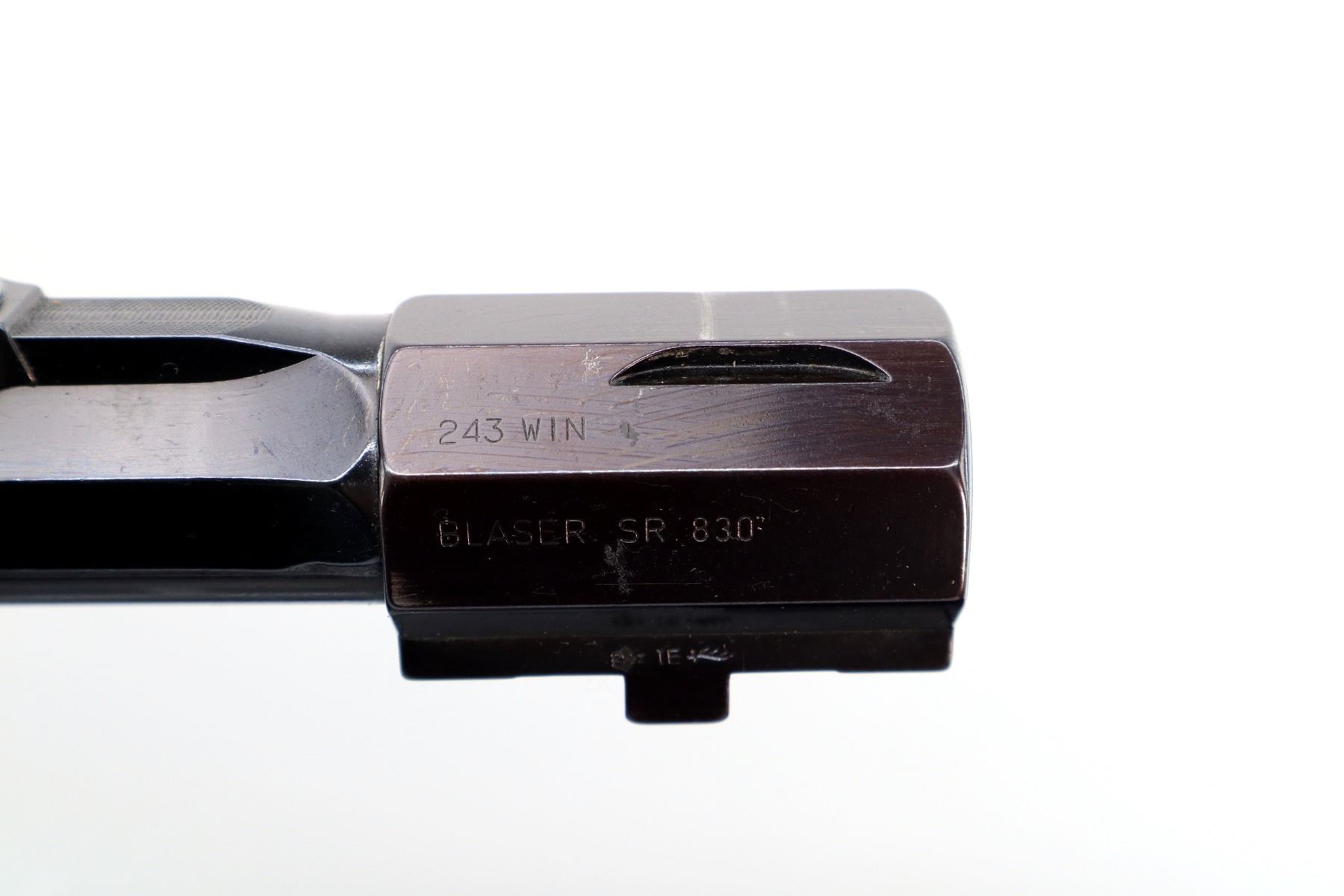 Main Description: Blade front sight with ramp, adjustable u notched rear sight, polish blued barrel with attached scope bases and Zeiss Diavari-Z 1.5-6x42 scope installed, clear optics three post reticle with fine lines , relief engraved silver receiver with game scenes, Satin black relief engraved bolt body with gold accents, Butter knife bolt handle. Two piece Satin finish wood stocks, checkered forearm and pistol grip, European cheek rest, Blaser logo black polymer butt plate, grip cap with brass medallion, sling swivels. Spare Barrel: .243 WIN, 23.25", Bore is Excellent, Blade front sight with ramp, adjustable u notched rear sight, polish blued finish, solid rib with scope bases and QD 1" rings, front sling swivels. Parts include: Complete .243 bolt assembly with Satin black carrier and black polymer magazine. Accessories include: 1" rings, rear ring has been disassembled.