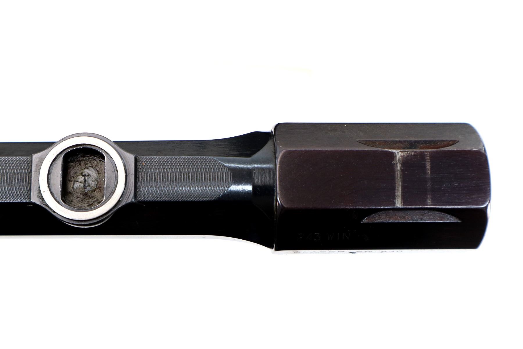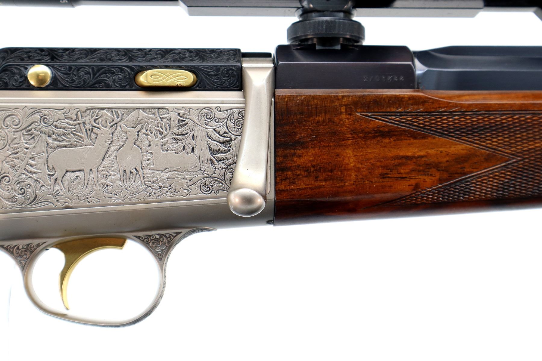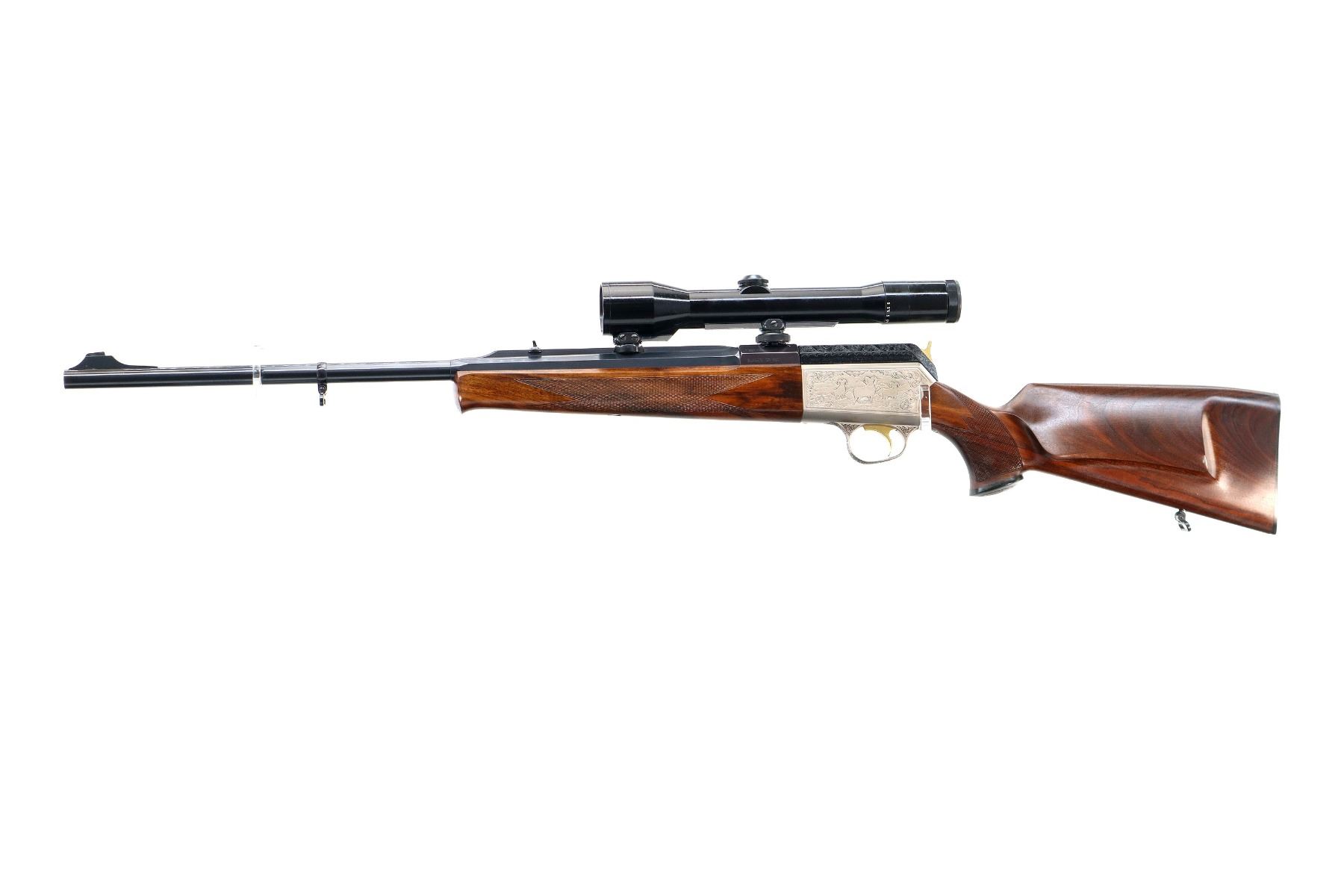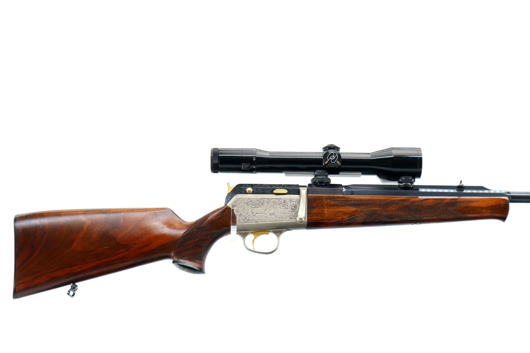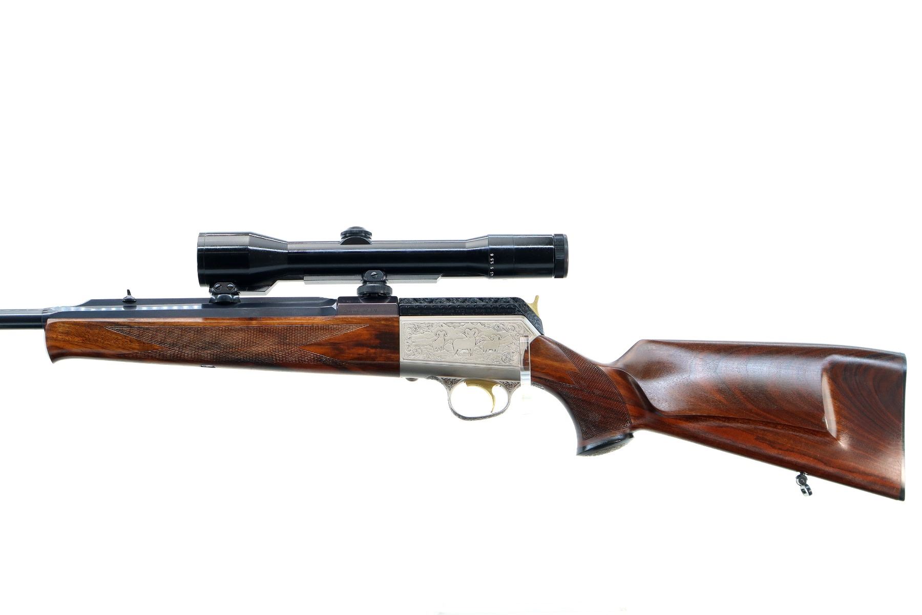 Main Description: Blade front sight with ramp, adjustable u notched rear sight, polish blued barrel with attached scope bases and Zeiss Diavari-Z 1.5-6x42 scope installed, clear optics three post reticle with fine lines , relief engraved silver receiver with game scenes, Satin black relief engraved bolt body with gold accents, Butter knife bolt handle. Two piece Satin finish wood stocks, checkered forearm and pistol grip, European cheek rest, Blaser logo black polymer butt plate, grip cap with brass medallion, sling swivels. Spare Barrel: .243 WIN, 23.25", Bore is Excellent, Blade front sight with ramp, adjustable u notched rear sight, polish blued finish, solid rib with scope bases and QD 1" rings, front sling swivels. Parts include: Complete .243 bolt assembly with Satin black carrier and black polymer magazine. Accessories include: 1" rings, rear ring has been disassembled.