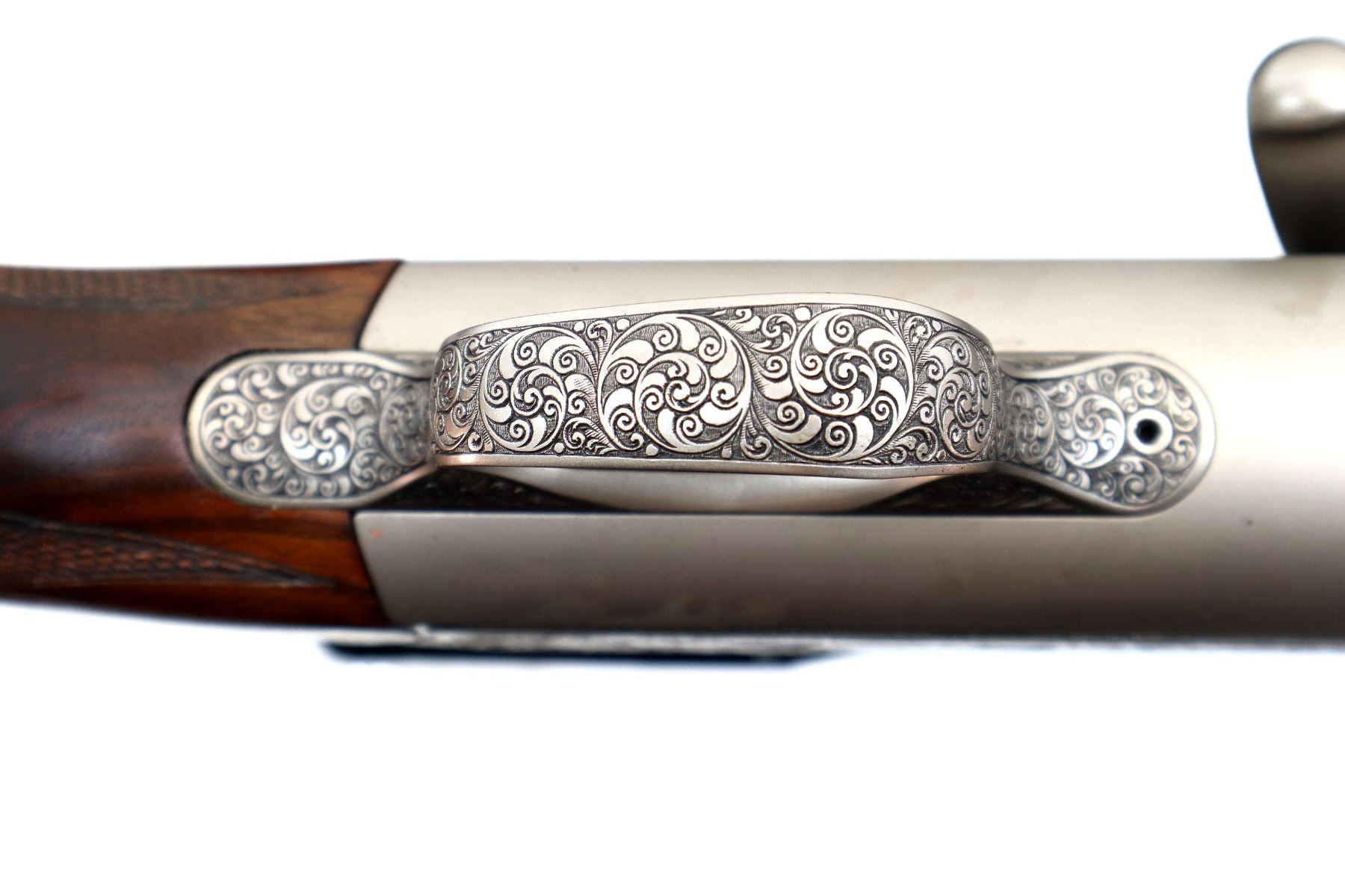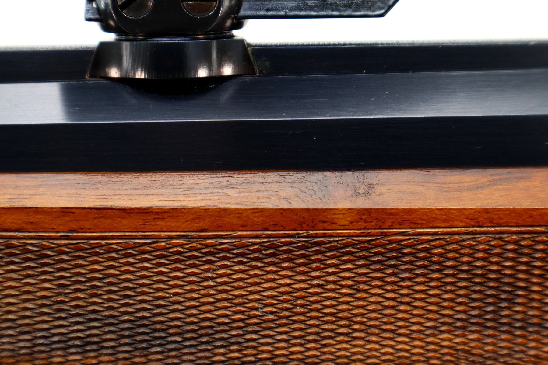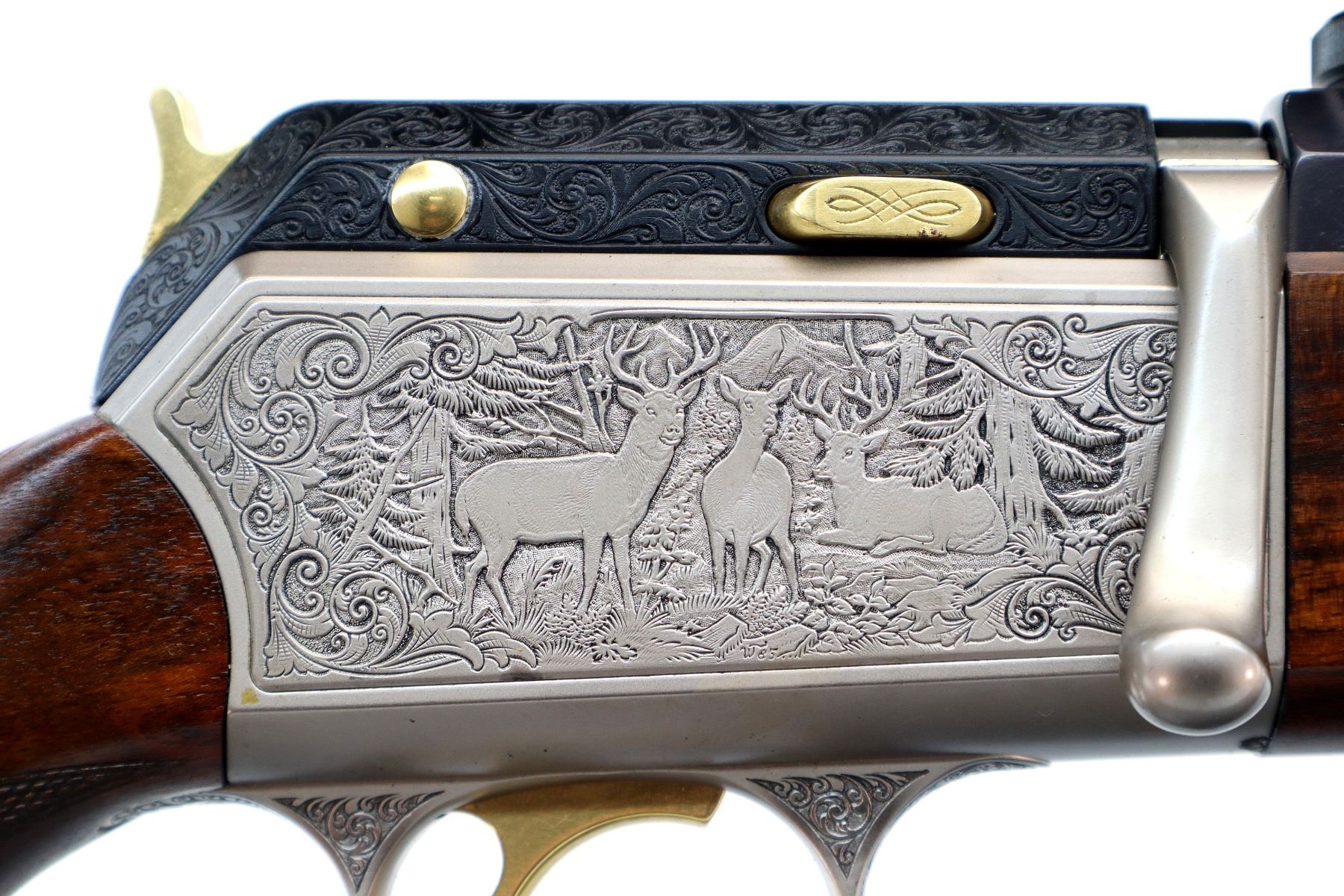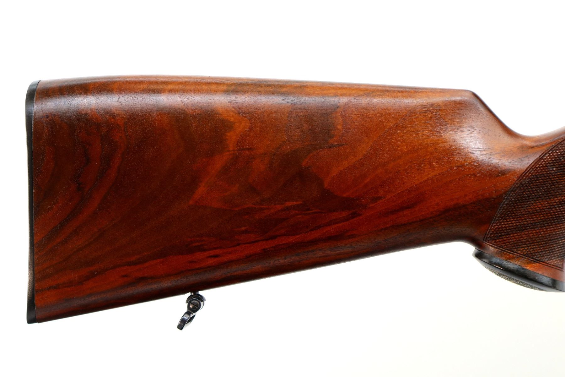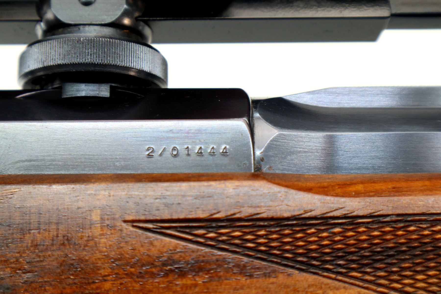 Main Description: Blade front sight with ramp, adjustable u notched rear sight, polish blued barrel with attached scope bases and Zeiss Diavari-Z 1.5-6x42 scope installed, clear optics three post reticle with fine lines , relief engraved silver receiver with game scenes, Satin black relief engraved bolt body with gold accents, Butter knife bolt handle. Two piece Satin finish wood stocks, checkered forearm and pistol grip, European cheek rest, Blaser logo black polymer butt plate, grip cap with brass medallion, sling swivels. Spare Barrel: .243 WIN, 23.25", Bore is Excellent, Blade front sight with ramp, adjustable u notched rear sight, polish blued finish, solid rib with scope bases and QD 1" rings, front sling swivels. Parts include: Complete .243 bolt assembly with Satin black carrier and black polymer magazine. Accessories include: 1" rings, rear ring has been disassembled.
