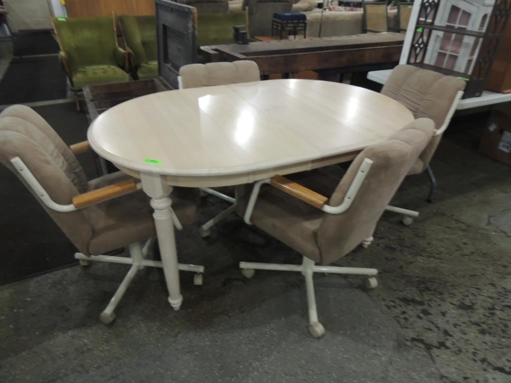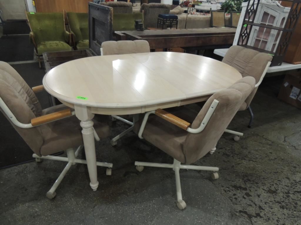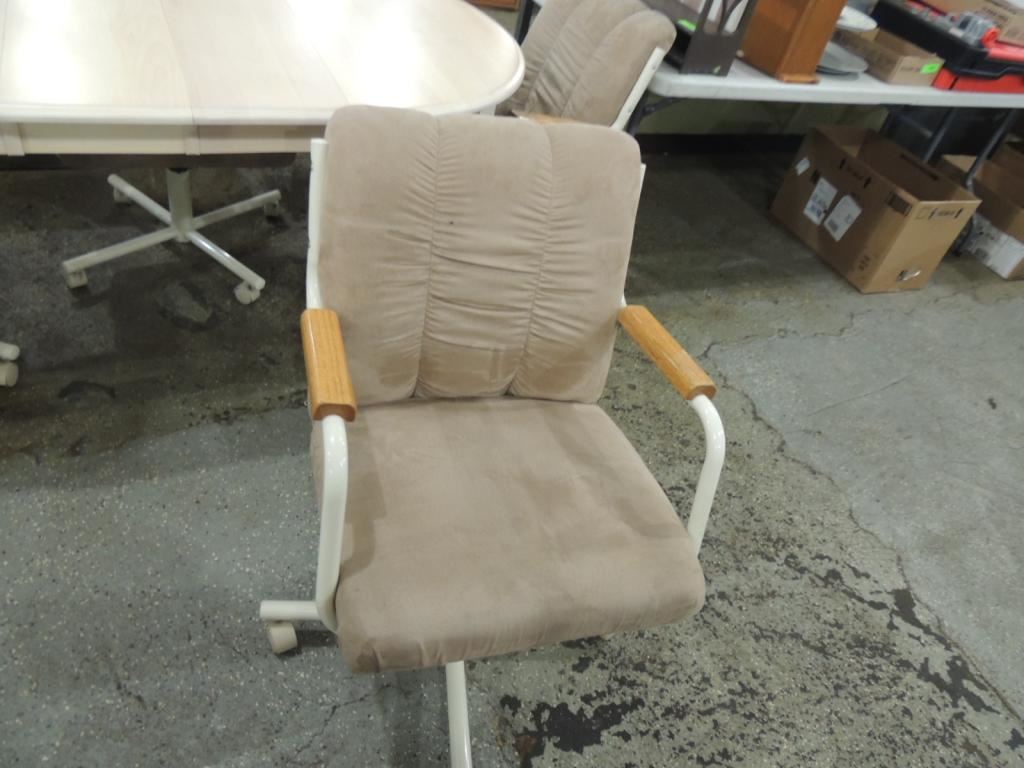 OVAL SOLID WOOD DINING TABLE, GREAT CONDITION, LEAVES, UPHOLSTERED CHAIRS ON WHEELS, TAN, CLEAN, AS SHOWN SEE PHOTO FOR MORE DETAILS.