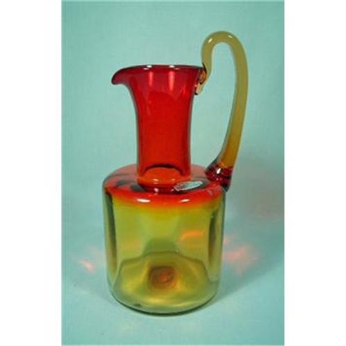 Beautiful Blenko Glass Company pitcher witih the origianl label still attached. Actually, Blenko called their amberina "Tangerine". The pitcher to the top of the unusual amber handle is 10 1/4" tall. The body of the pitcher is circular with verticle columns and is 5" tall. The neck to the top of the lip is 4". No damage, and a very collectible and stunning piece. Hand blown with pontil mark.