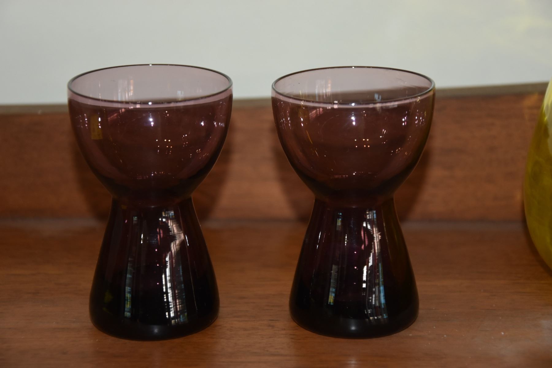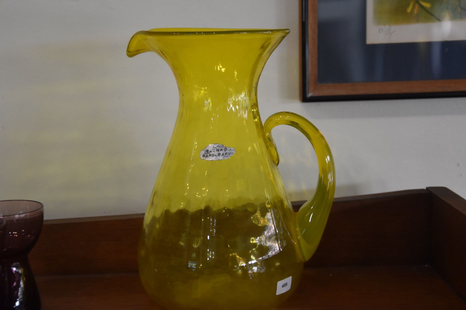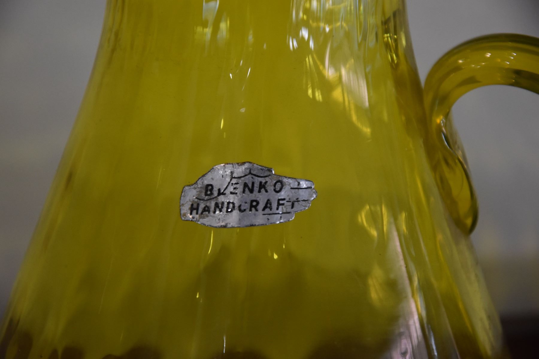 BLENKO WATER PITCHER & VINTAGE MID CENTURY MODERN MORGATOWN GLASS CO. AMETHYST CANDLE HOLDERS, BARTON PATTERN (3 PCS)