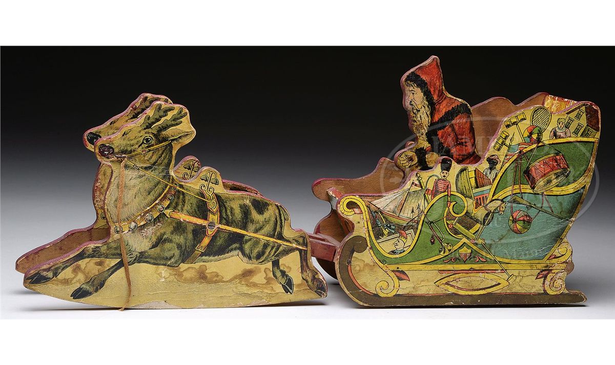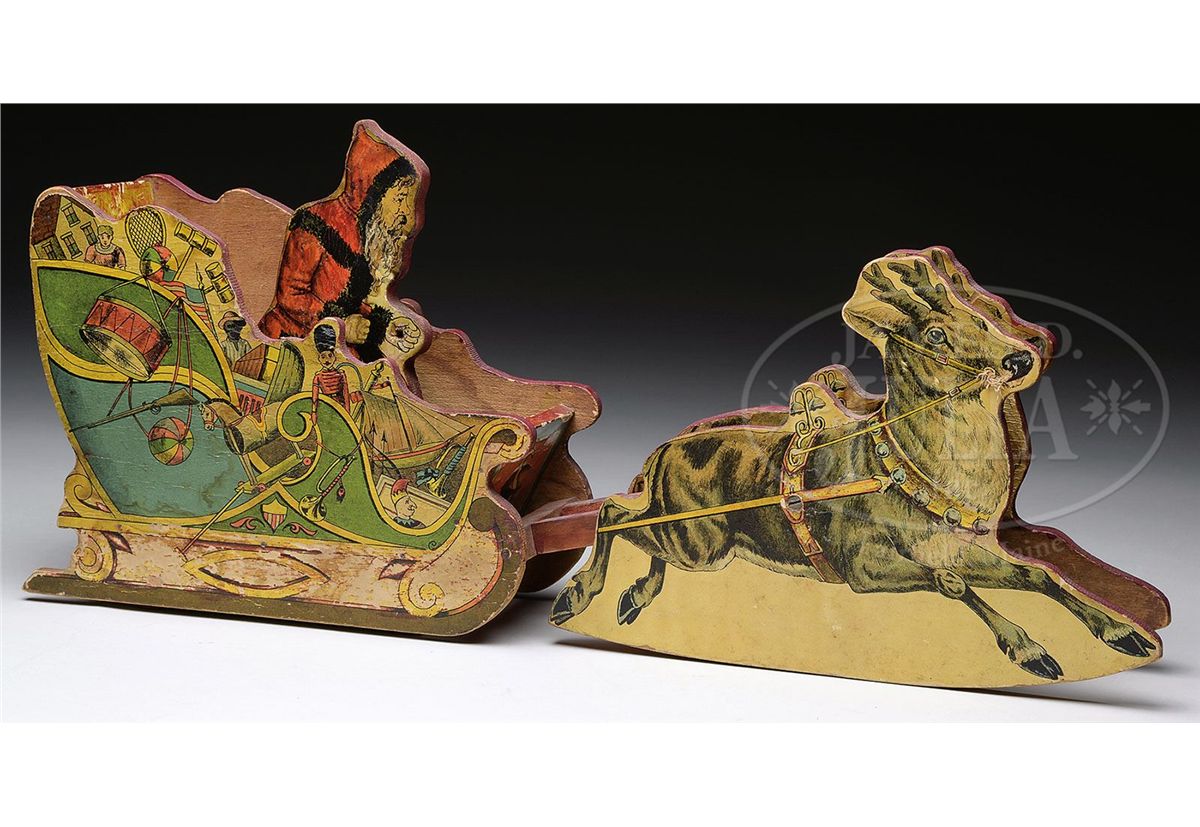 Wooden pull toy circa 1890s shows galloping reindeer at front and paper on wood sleigh to rear. Santa sits with reins. Paper lithograph on side of sleigh shows guns, drums, bugles, dolls, clown and soldier toys. SIZE: 17-1/2" l. CONDITION: Overall condition of paper litho is good to very good with some light staining/darkening. Left lower side by runners shows fair amount of wear to paper litho. Some enhancement to red coloring on Santa figure and perhaps red paint enhancement to wooden edges on top of sleigh and reindeer 1-13362