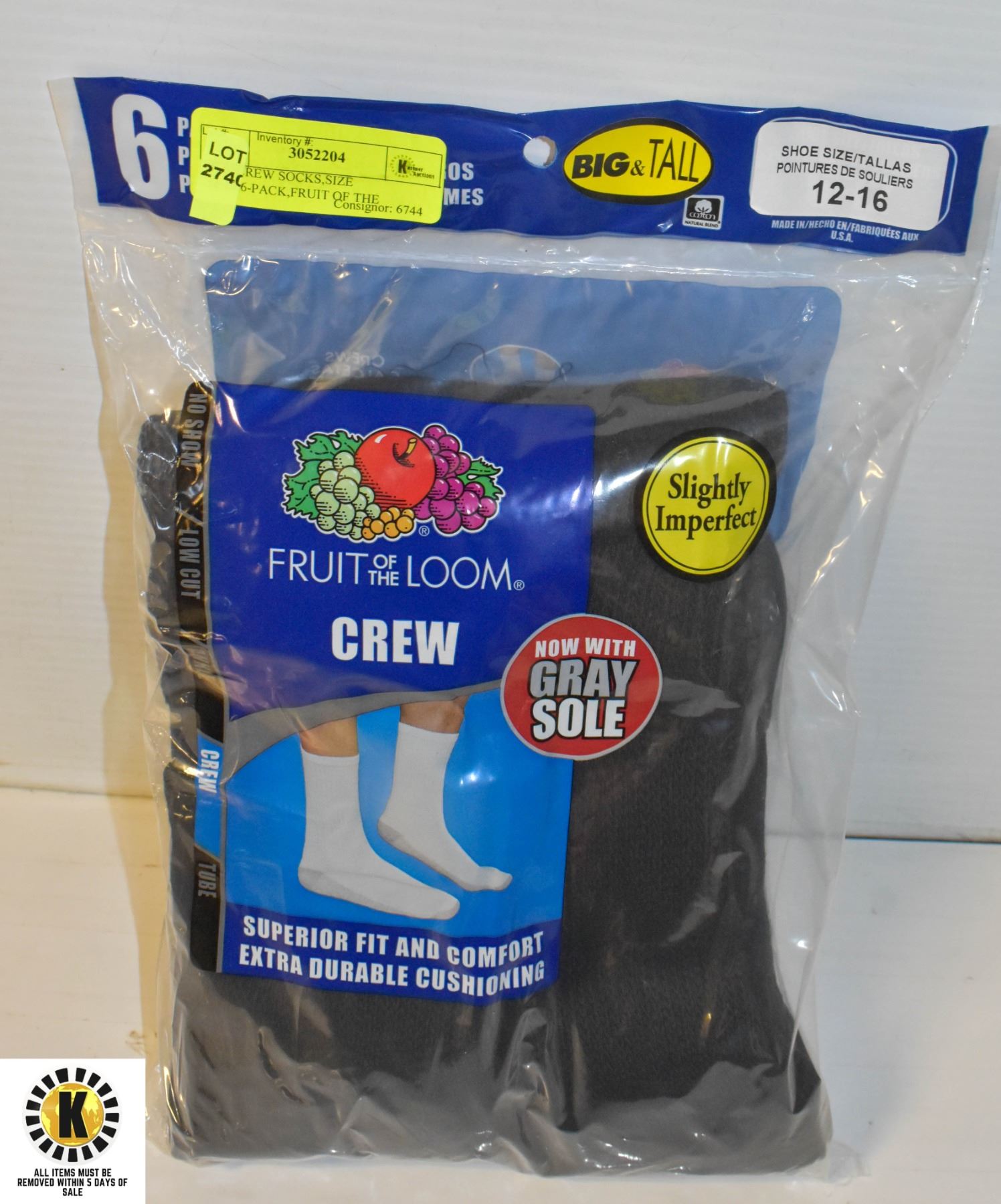 BLK CREW SOCKS,SIZE 12-16,6-PACK,FRUIT OF THE