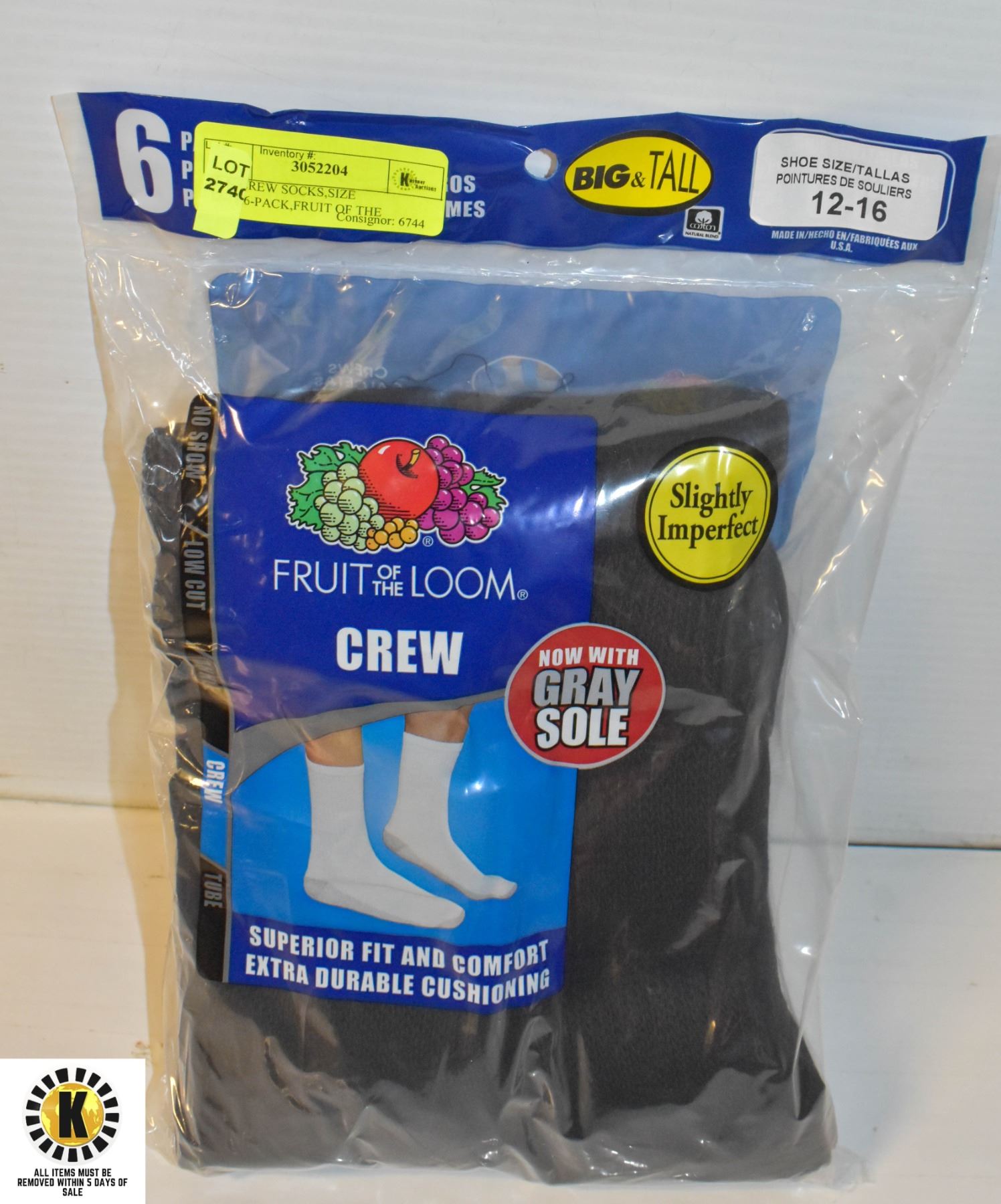 BLK CREW SOCKS,SIZE 12-16,6-PACK,FRUIT OF THE