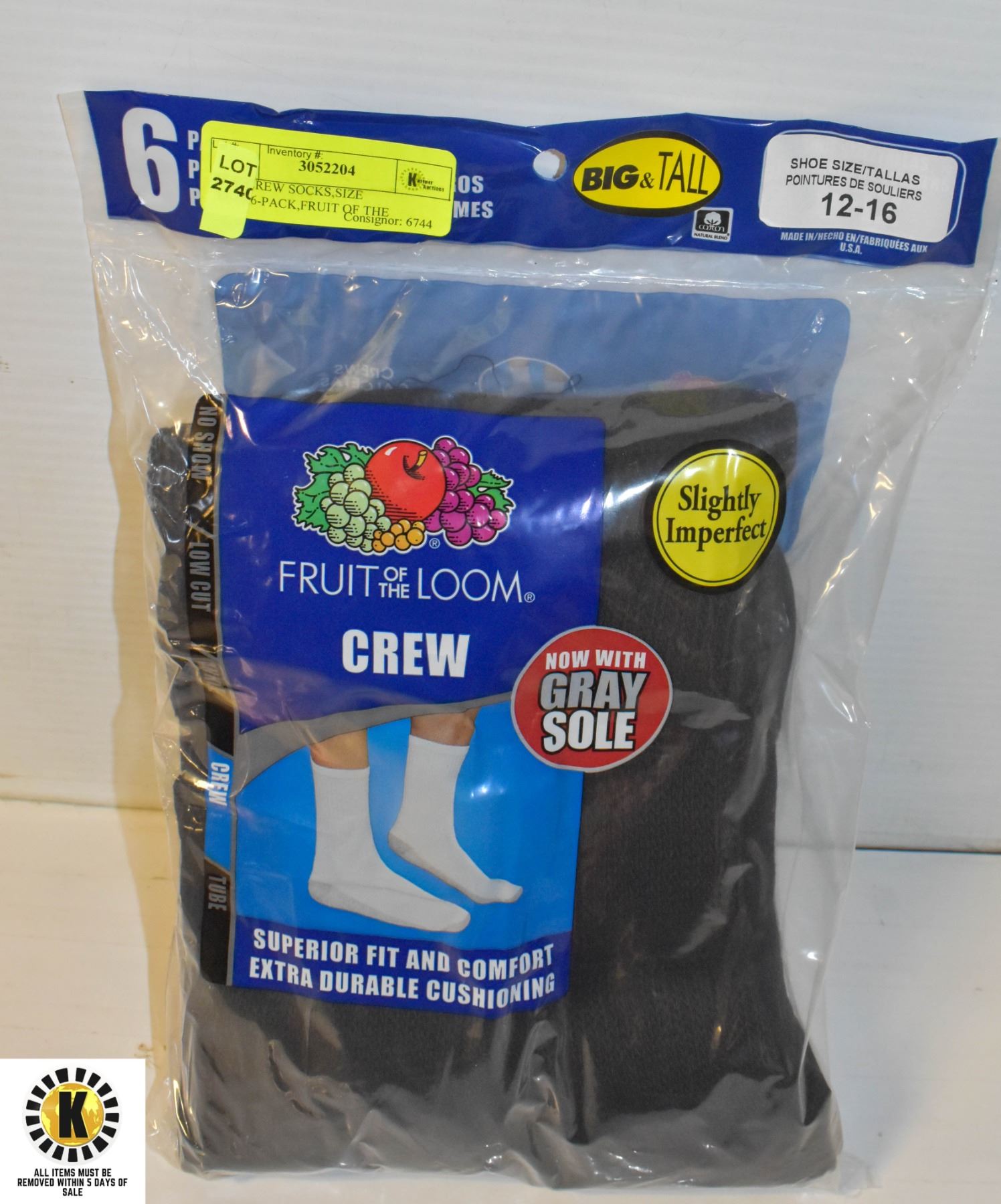 BLK CREW SOCKS,SIZE 12-16,6-PACK,FRUIT OF THE