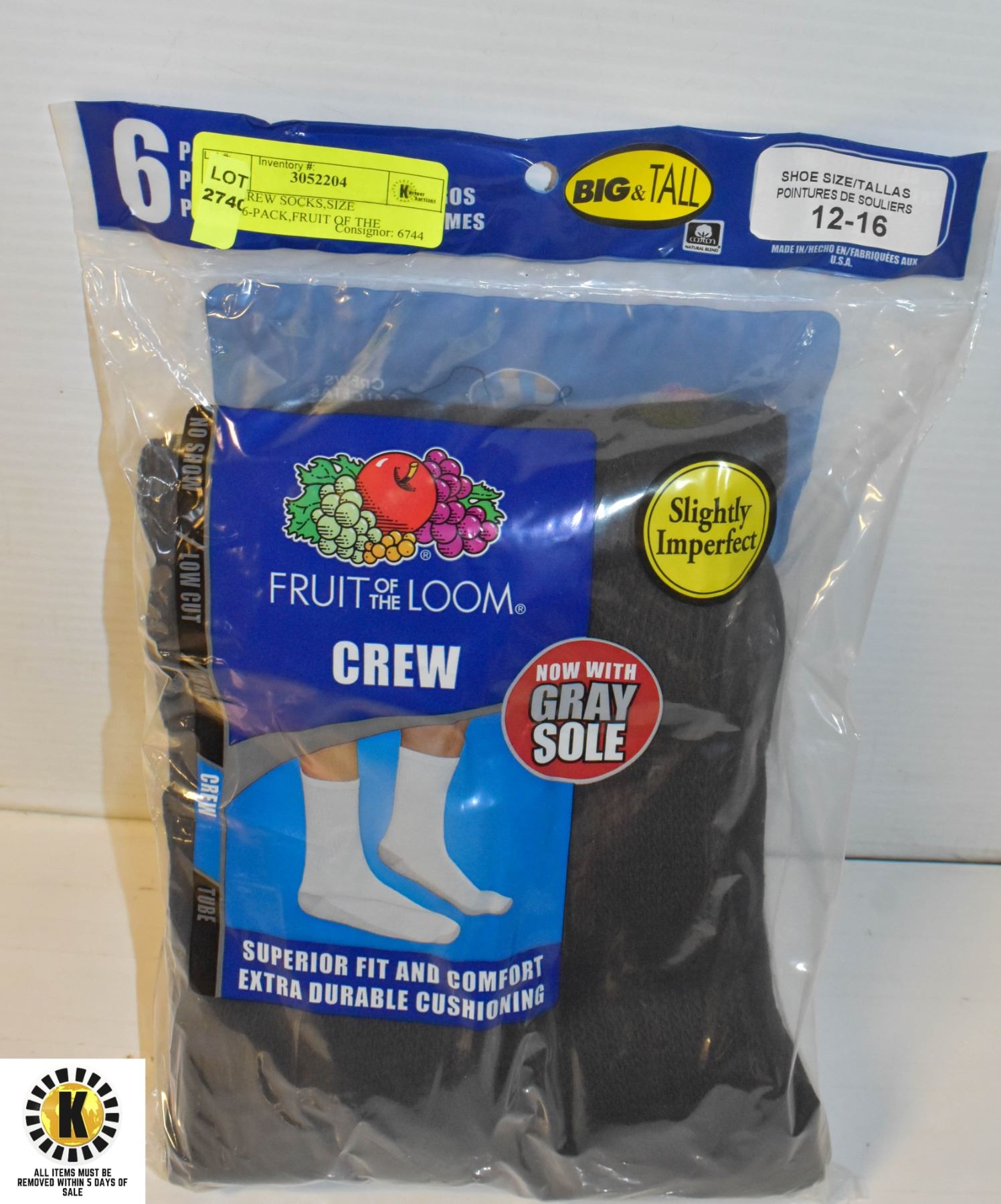 BLK CREW SOCKS,SIZE 12-16,6-PACK,FRUIT OF THE