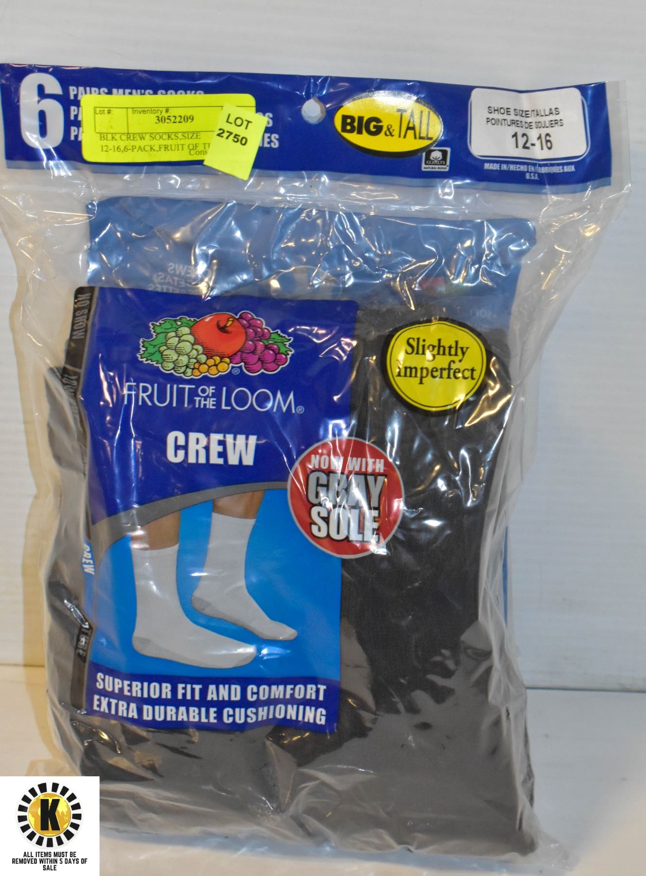 BLK CREW SOCKS,SIZE 12-16,6-PACK,FRUIT OF THE