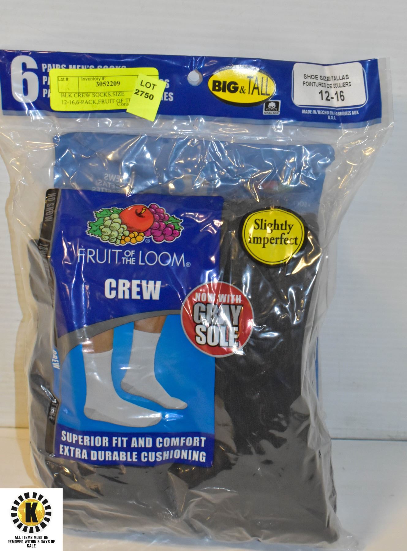 BLK CREW SOCKS,SIZE 12-16,6-PACK,FRUIT OF THE