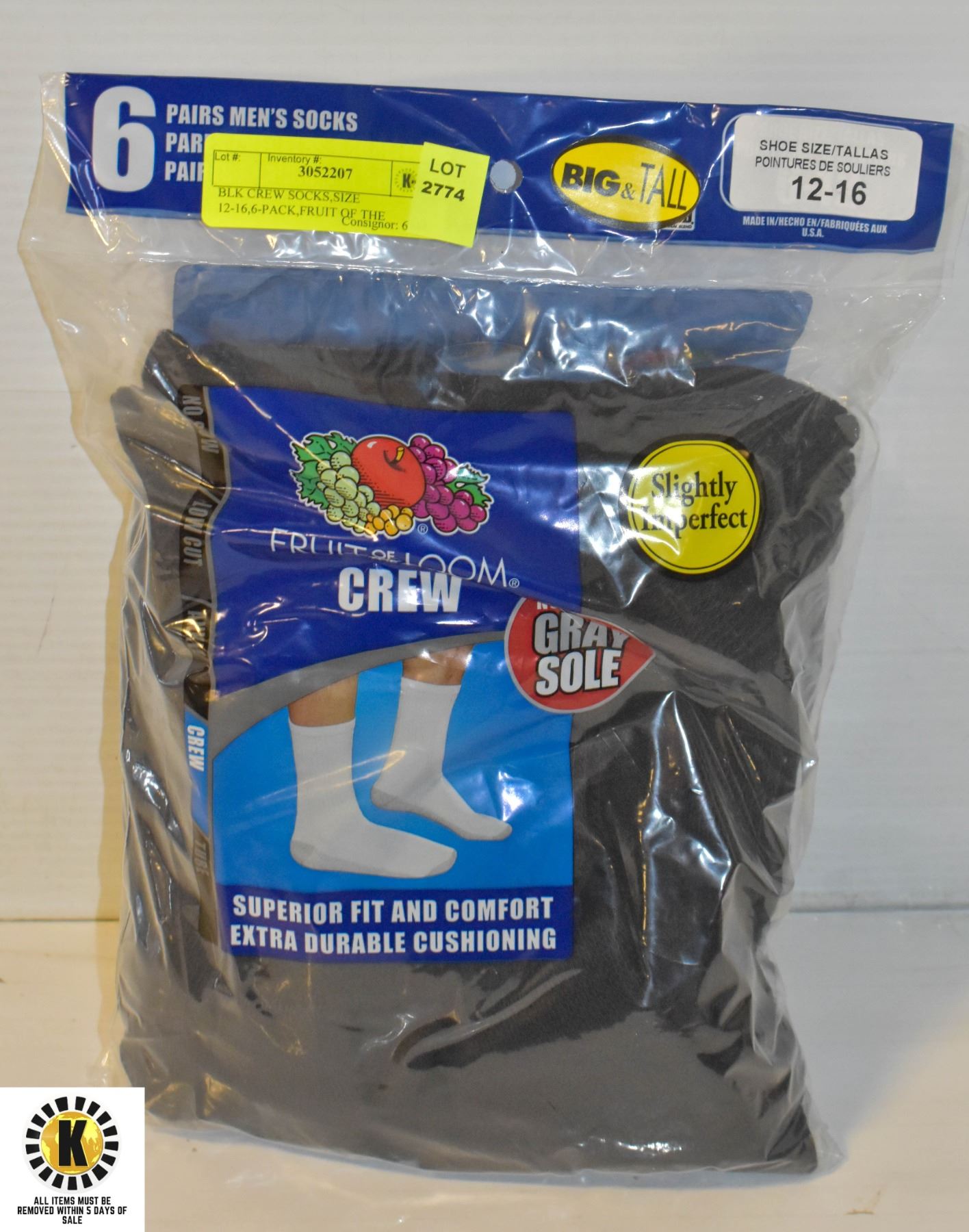 BLK CREW SOCKS,SIZE 12-16,6-PACK,FRUIT OF THE