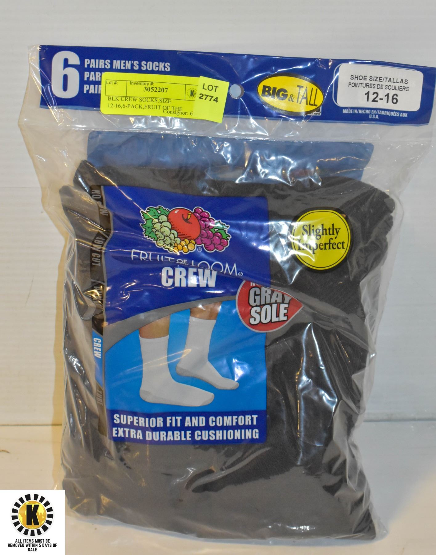 BLK CREW SOCKS,SIZE 12-16,6-PACK,FRUIT OF THE