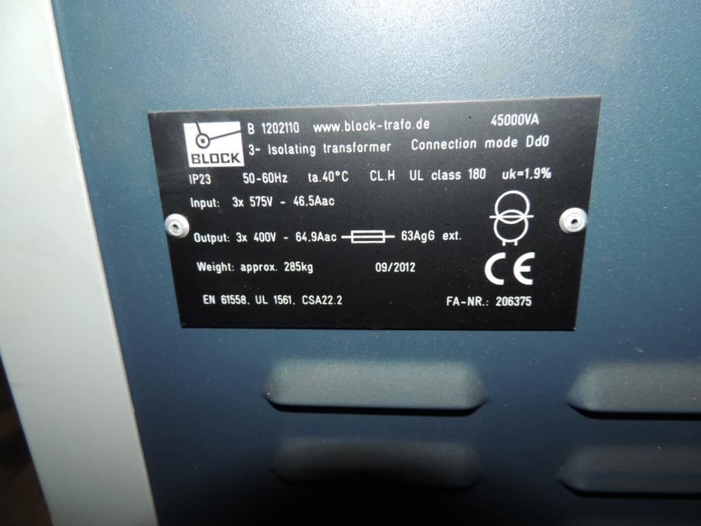 INPUT 3X 575V OUTPUT 3X 400V TRANSFORMER. AS SHOWN SEE PHOTO FOR MORE DETAILS.