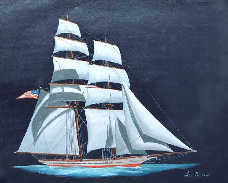 Artist: Alexander Blokhin (b.1971) - Title: French Brig - Medium: Acrylic on Canvas - Signature: This one-of-a-kind work is hand-signed by the artist at the bottom of the image - Image Size: Approximately 16 inches x 20 inches - Biography: Alexander Blokhin was born in Minsk in 1971 and he graduated the MAST (Minsk Architectural College) - in the specialty "Architecture" and studied at the Architectural Academy in Minsk. In 1998 he began working with the National Maritime Museum in Haifa, Israel.For several years, has built more than 25 models of ships of various historical periods. His models are placed on permanent display. - He was the organizer of 3 shows of the scale models of ships at the National Maritime Museum in Israel and has worked with the Museum of Science and Technology, the City Museum and others. Today, he still works closely with museums in Germany, Cyprus and the United States. From 2005 to present, he is the curator of "Maritime Heritage Center" at the company CORAL MS -