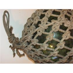 BLOWN GLASS FLOAT. Glass is green and has rope shell. 12" Dia.