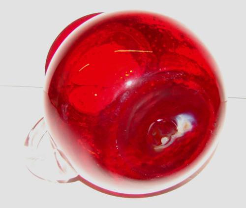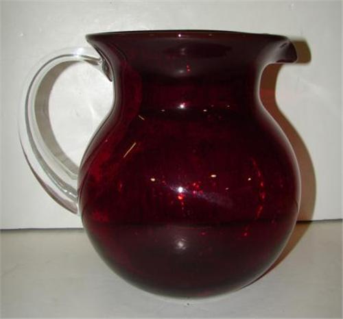 BLOWN RUBY GLASS PITCHER. Has applied clear glass handle. Numerous air bubbles are visible in the ruby glass. 7.75” H