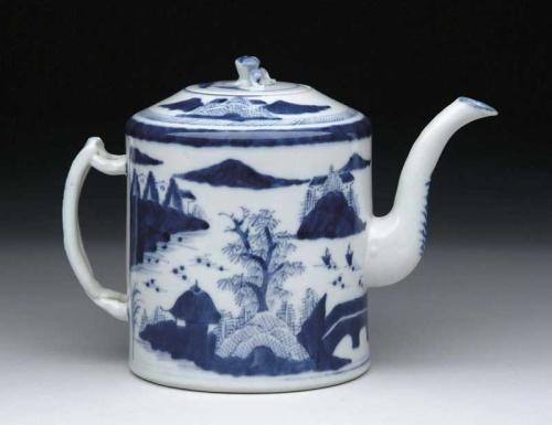 BLUE AND WHITE CANTON COVERED TEAPOT. Large size with strap type handle. SIZE: 7” h x 9-1/4” at widest. CONDITION: Very good. 9-27640