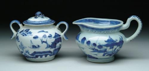 BLUE AND WHITE CANTON CREAMER AND COVERED SUGAR. Standard creamer. Sugar bowl has two loop handles, small domed cover with nut finial. SIZE: 4in. h. CONDITION: Very good. Slight glaze roughness to edges. 9-26087