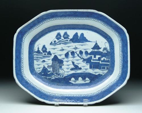 BLUE AND WHITE CANTON PLATTER. Cut corner shape with standard scene. 19th C. SIZE: 12in. x 14-1/2in.. CONDITION: Very good. 9-26082