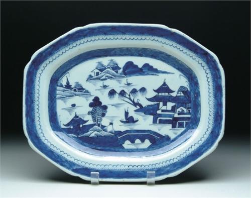 BLUE AND WHITE CANTON PLATTER. Cut corner shape with standard scene. 19th C. SIZE: 10-1/2in. x 13in.. CONDITION: Very good. 9-26083