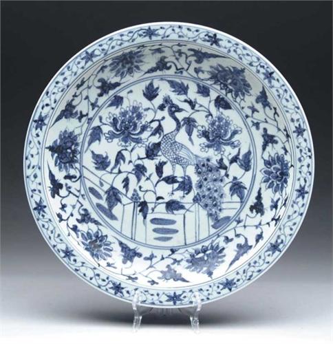 BLUE AND WHITE ORIENTAL CHARGER. Decoration with blue peacock, flowers and vines. Six character mark to base. Unknown age. SIZE: 16” dia. CONDITION: Very good. 9-27095