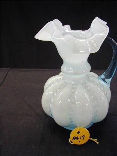BLUE ART GLASS CASED W/WHITE LINING RUFFLE EDGED PITCHER 6inT EXCELLENT