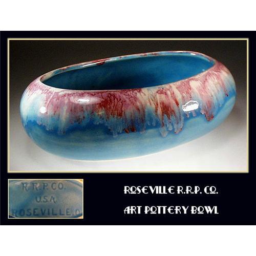 Vintage Art pottery bowl. MINT condition, no chips, cracks or repairs. The base is marked : R.R.P. Co., Roseville U.S.A. It measures approx. 9-1/2"L x 6"D and 3"H.