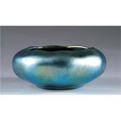 Lot 600 BLUE AURENE BOWL Lovely Steuben blue Aurene bowl has slightly ribbed sides with platinum blue iridescence. Interior of bowl has bright blue iridescence with flashes of gold. Signed on bottom “Steuben Aurene 564”. SIZE: 7” dia x 3” t. CONDITION: Some inconsistency to iridescence, but condition is very good to excellent. 5-71050