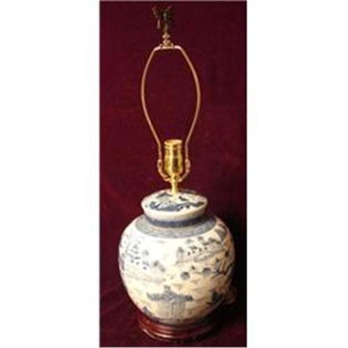 Circa 1900 Chinese Export Large Blue Canton Ginger Jar convereted into a table lamp. This lamp has been professionally been wired and is UL Approved. We use good quality hardware and rosewood stands and covers. This lamp has a porcelain cover instead of a rosewood cover. This jar measures in size from Rosewood Base to Rosewood Cap/Cover 10 1/2" in height and is 21" in total height to the top of the harp where the shade fits on and is connected by a finial. This lamp is of Very Good Quality with a Medium to Dark Blue Canton Color. This is the first time in several years that we have been able to locate original blue canton ginger jars often referred to as storage jars to make into usable lamps. Harp and shade is included. More images are available upon request