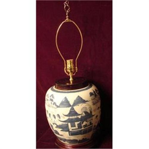 Circa 1900 Chinese Export Large Blue Canton Ginger Jar convereted into a table lamp. This lamp has been professionally been wired and is UL Approved. We use good quality hardware and rosewood stands and covers. This jar measures in size from Rosewood Base to Rosewood Cap/Cover 13 1/2" in height and is 24" in total height to the top of the harp where the shade fits on and is connected by a finial. This lamp is of Very Good Quality with a Medium to Dark Blue Canton Color. This is the first time in several years that we have been able to locate original blue canton ginger jars often referred to as storage jars to make into usable lamps. Harp and shade. is included.