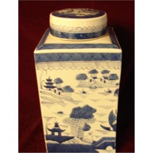 20TH Century approximately 1920-1930 Chinese Export Blue Canton Extremely Rare Blue Canton Tea Cannister with original cover. Chinese Export Tea Cannisters, tea poys and tea caddies are very rare. 18TH and 19TH Century Tea Cannisters are just impossible to find. This is a 20TH Century example of the Blue Canton Pattern Tea Cannister measuring 14 1/2" to the top of the cover and 12" to the top just past the side border just above the rain and cloud canton border. The width at that point is 7 1/2" Square. We believe that the cover is not original but it looks good with it on showing it as a Complete Piece.Additional Images are available upon request. A Blue Canton tea cannister from the early 19th century would probably sell for over $10,000.00. This one is in Excellent Condition with no chips, cracks, or Restoration. Presently in our inventory we have a 18TH Century Nanking Tea Cannister with a replaced wooden cover of appreoximately the same size.