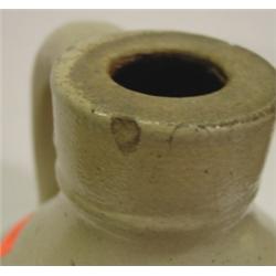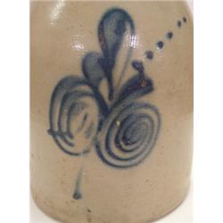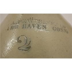 BLUE DECORATED CONNECTICUT STONEWARE JUG. 2 gallon. Stamped near top of body "S.L. Pewtress & Co.-Fair Haven, Conn.-2". Blue floral line decoration on body. One small chip on outside of top rim. One small crack and firing mark on bottom of body. One small spider crack on bottom of base. 14" H