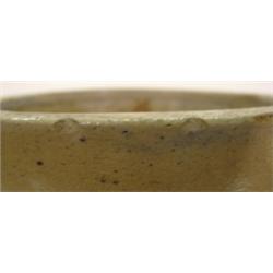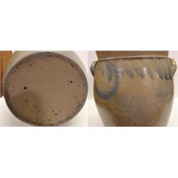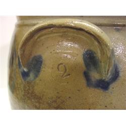 BLUE DECORATED OVOID STONEWARE CROCK WITH EARED HANDLES. 2 gallon. Stamped "2" near top under handle. Faint blue decoration along top of body. Two chips along top rim. Chipping and damage to one handle. 12" H, 8.25" Dia.