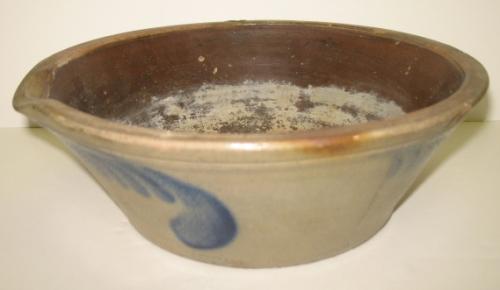 BLUE DECORATED STONEWARE MILK BOWL WITH SPOUT. Cobalt blue thumb feather decoration around body. One chip on top rim. Two hairline cracks on body. One running from top to bottom measuring 4.5” L and the other running from top to bottom measuring 3” L. 4” H, 11.5” Dia.