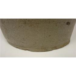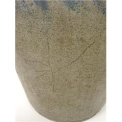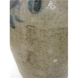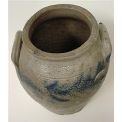 BLUE DECORATED STONEWARE CROCK WITH EARS. 2 gallon. Marked "2" on body. In need of cleaning. Has roughness along bottom of base with several chips. Has chip on side measuring 1.5". 11.75" H